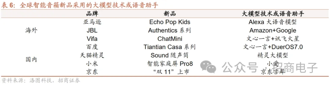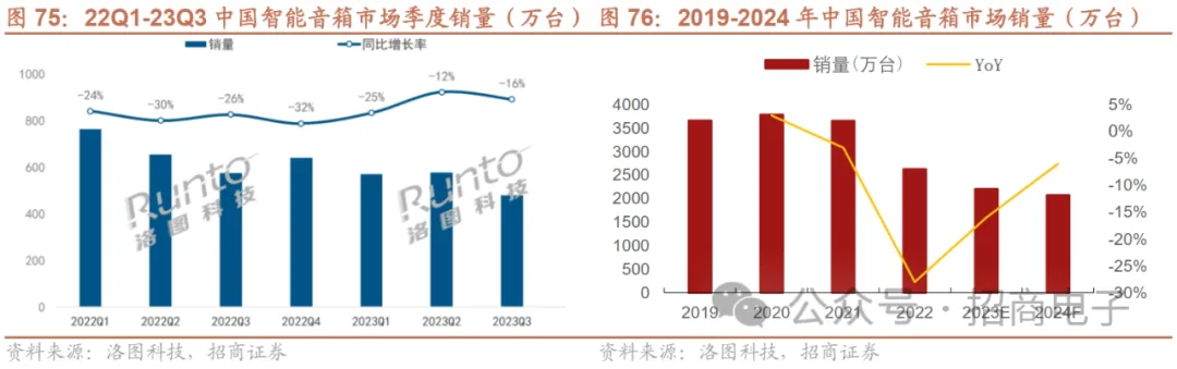 (2)音箱:23Q2~23Q3中国智能音箱销量同比跌幅有收窄趋势,预计23全年同比下跌16%。当前智能音箱出货量增长放缓,源于存在交互体验不佳、应用场景单一、个性化能力弱等问题。据洛图科技,22Q2~23Q1中国智能音箱销量同比跌幅超25%,尽管尚未不到筑底信号,但Q2~23Q3中国智能音箱销量同比跌幅有收窄趋势,分别下滑12%和16%,23Q3销量为481万台。洛图科技认为智能音箱品类仍然是大厂触达用户最重要的入口之一,判断智能音箱市场的下行空间已经缩小,预测23Q4中国智能音箱销量将达580万台,同比下降9%, 2024年中国智能音箱市场销量将下降至2076万台,同比下跌6%。 AI大模型有望驱动音箱2.0升级,持续关注AI技术在智能音箱落地情况。随着接入大模型的“鸟鸟分鸟”音箱发布,智能音箱重新引起市场关注,AI大模型或驱动智能音箱2.0升级,亚马逊、JBL、百度、天猫精灵、小米、京东等品牌智能音箱陆续接入大模型。