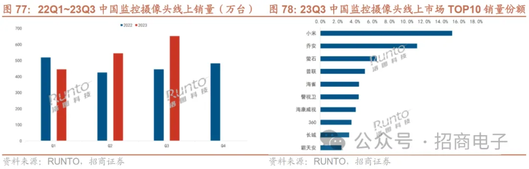 (3)摄像头:23Q3中国摄像头线上市场销量延续同比增长,预计2023年销量同比+24%至超2300万台。进入疫情后的2023年,办公室、出差、旅游等家庭外场景增多,消费者对家庭房间的安全监控,以及对老人儿童宠物的智能监控诉求推动着摄像头市场规模向上增长。据洛图科技,23Q2中国监控摄像头市场线上销量同比增长27.7%;23Q3销量为652万台,同比增长46.8%,销额为14.7亿元,同比增长49%。洛图科技预测,2023年中国监控摄像头线上市场销量将达到2328万台,同比增长24%。分品牌看,小米、乔安和萤石稳居线上前三。小米销量位居第一,销量占比为15.2%,小米2云台版和3云台版摄像头带动品牌销量同比上涨32.4%。乔安连续3个季度销量份额成上升趋势,23Q3升至11.2%。其重点在天猫平台电商发力,产品促销力度大,新品上量快。萤石排名第三,销量份额6.5%,销量同比增长28.4%。萤石推出摄像头+智能门锁+智能门铃多产品线生态体系,持续向家庭渗透。其母公司海康威视重点布局户外产品,双品牌在消费级市场形成了室内+室外的闭环。