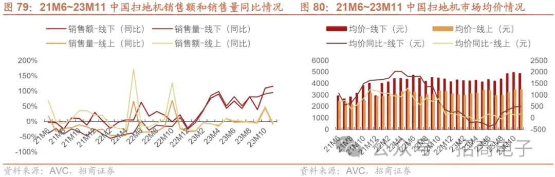 (4)扫地机:2023年1~11月扫地机行业整体呈现弱复苏趋势。受消费需求疲软影响,扫地机作为价格较高的可选消费品受到冲击。据奥维云网数据,2023年行业以价换量策略逐步奏效,1~11月扫地机需求整体呈现弱复苏趋势,行业渗透率有望重回增长态势。