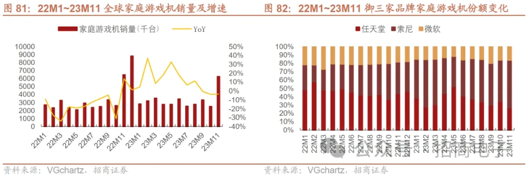 (5)游戏机:受益于PS5换机需求,23M1~11游戏机销量同比增长约9%。据VGchartz,2023年随着PS5供应缓解,受益于PS5换机需求,PS5销量实现同比高增长,带动23M1~M11游戏机整体销量同比增长9%至近3608万台。其中,23Q1~Q2销量同比增速均超双位数,而23Q3销量同比上涨约5%至约870万台,23Q3增速放缓主要系PS5销量增速放缓,而Switch销量下滑较大,主因Switch进入生命周期第7年导致换机动力不足,同时Xbox Series需求不佳,销量亦下滑较大。展望后续,当前PS5和Xbox仍处于新一代主机换机阶段,索尼官方指引23/4/1-24/3/31 PS5销量同比+30.9%至2500万台。考虑到Switch进入生命周期后半段,任天堂官方指引23/4/1-24/3/31 Switch销量同比-16.5%至1500万台,但下一代游戏机正处于研发中,在未来有望提供新增长动能。