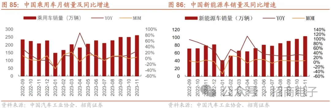 23H1国内汽车需求逐步复苏,23Q3汽车行业进一步修复,乘用车总体销量及新能源车市场均实现同环比提升。受燃油车购置税优惠及新能源车国补退出影响,23Q1国内汽车销量出现下滑。在各地营销活动、轻型车国六实施公告发布、企业新车型大量上市、车企半年度冲量等因素的共同拉动下,23Q2汽车市场需求逐步恢复。受益于消费需求复苏、新能源车密集上市、燃油车稳健运行等因素影响,7~8月车市淡季不淡,叠加9月传统旺季带动,23Q3乘用车及新能源车市场总体产销进一步提升。23M12全国乘用车市场零售同环比持续走强,新能源车消费热度持续;预计2024年国内汽车总销量+3%。根据乘联会数据,2023年12月(1-24日)国内乘用车共计零售152.5万辆,同比+5%/环比+20%;今年以来累计零售2086.9万辆,同比+5%。年末市场走势仍较好,主要系多地开展线下车展/消费券等促销费活动,同时车企为完成年度销量开启新一轮促销降价所致。2023年12月(1-24日)国内新能源车市场零售56.7万辆,同比+22%/环比+10%。展望未来,中汽协预测2023/2024年国内汽车总销量3000/3100万辆,同比+11.7%/+3%,其中新能源车940/1150万辆左右,同比+36.5%/+20%,出口分别为480/550万辆左右。宏观经济复苏、国家宏观产业和消费政策支持、汽车产业链热度将带动2024年汽车行业发展。