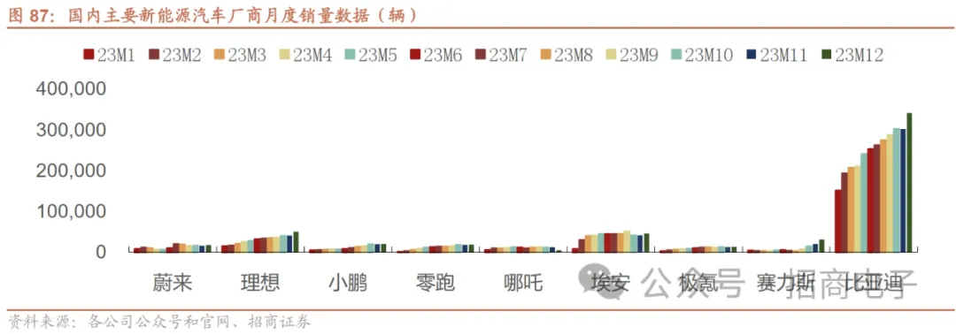 全年目标;比亚迪全年销量突破300万辆。根据目前已有的各大新能源汽车厂商公布的信息,1)比亚迪12月销售34.1万辆,同比+45.0%/环比+13.0%;年度销量302.4万辆,同比+62.3%,完成全年300万台销量目标。2)埃安12月销售4.6万台,同比+53.1%/环比+10.5%;年度销量48.0万辆,同比+77.0%,略低于50万辆的全年销量目标。3)理想12月交付5.0万辆,同比+137.1%/环比+22.7%,实现月交付5万台的目标;2023年全年交付37.6万辆,同比+182.2%,年度销量目标完成率125.3%。4)赛力斯汽车12月销量3.1万台,同比+210.0%/环比+55.0%,其中问界系列12月交付量2.5万辆,环比+30.0%,首次突破 2万台,全年交付9.4万辆。5)小鹏12月交付2.0万辆,同比+78.1%/环比+0.4%;全年累计交付14.2万辆,同比+17.3%,年度销量完成度近70%。6)蔚来12月交付1.8万台,同比+13.9%/环比+12.9%;全年交付16.0万台,同比+30.7%,全年销量目标完成率65.3%。