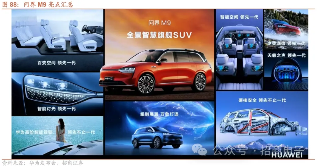 2023年12月26号问界M9携10大黑科技正式发布,上市2小时大定破万,上市7天大定突破3万台。问界M9为鸿蒙智行旗下年度最重磅产品、鸿蒙智行首款全景智慧旗舰SUV,搭载华为最新全栈技术解决方案,包括HUAWEI xPIXEL百万像素智慧大灯、满配十屏的屏幕系统、HUAWEI xHUD华为临境抬头显示系统、HUAWEI ADS 2.0高阶智能驾驶辅助、全维安全、途灵智能底盘、巨鲸800V高压电动平台、全新小艺智慧助手、全新HUAWEI SOUND卓越系列、第四代超级增程平台。问界M9增程Max/Ultra版售价46.98/52.98万元起,纯电Max/Ultra版售价50.98/ 56.98万元起。截止2024年1月1日,问界M9上市7天累计大定突破3万台;此外问界新M7累计大定已超12万辆。问界交付能力持续提升,2024年起单月交付能力预计将突破3万辆。