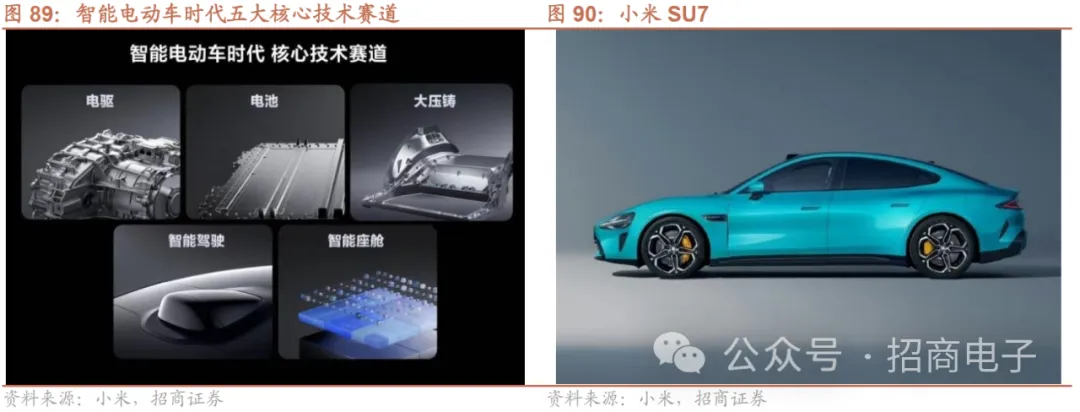 2023年12月28日小米举行小米汽车技术发布会,介绍了小米汽车的五大核心技术布局及首款新车小米SU7系列的部分特性。五大核心技术:小米深度布局电驱、电池、大压铸、智能座舱、智能驾驶领域核心技术赛道,1)超级电机V6/V6s最高转速远高于Model S;2)电池方面自研CTB一体化电池技术、800V碳化硅高压平台、行业首创电芯倒置技术;3)大压铸方面具备9100t最大锁模力、自主设计大压铸设备集群、自研小米泰坦合金;4)智驾方面推出3大感知技术创新+自研端到端感知决策大模型,目标24年进入智能驾驶第一梯队;5)座舱方面五屏联动,澎湃OS赋能全面生态共享能力。小米SU7前瞻:共2个版本,定位C级高性能生态科技轿车,在外观内饰设计、电机底盘性能、充电续航能力、安全性能方面具备特色,如拥有全球轿车最低风阻Cd0.195,国内电车最大105L前备箱、超越保时捷TaycanTurbo的零百加速2.78秒/最高车速265km/h/百零制动距离33.3米等。小米汽车目标通过15到20年的努力,成为全球前五的汽车厂商。目前价格尚未公布,产品已小规模量产,预计24H1正式上市。