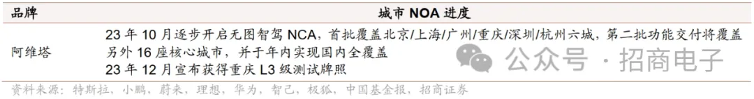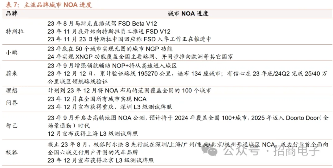 政策+应用端进展加速,中高阶自动驾驶渐成车企竞争焦点。1)政策方面,国内11月17日工信部等四部门联合印发《关于开展智能网联汽车准入和上路通行试点工作的通知》,L3/L4级自动驾驶可获批上路,同时首次明确高阶智驾事故责任归属。《通知》发布以来,目前已有北京、上海、重庆3个城市开放L3级路测,已有宝马、奔驰、智己、深蓝、极狐、阿维塔、比亚迪、问界等车企宣布获得首批高快速路L3级自动驾驶测试牌照,智能网联汽车产业化进程有望加速。2)应用方面,2023年车企NOA纷纷从高速路段向城市路段快速拓展,小鹏、问界、理想、蔚来、长城、阿维塔等年内均有城市NOA落地或相关落地规划。同时,特斯拉FSD V12迎来落地前夜,FSD入华渐进。11月底特斯拉开始向员工推送FSD Beta V12,首次采用端到端神经网络进行车辆控制,可大幅简化代码,本次参与车辆总数超1.5万辆。此外,11月23日特斯拉中国回应称FSD入华工作正在推进中。有望进一步对国内中高阶智能驾驶渗透起到催化作用。