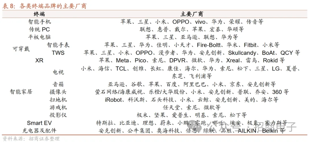 三、产业链跟踪:安卓产业链公司业绩率先复苏,关注苹果Vision Pro/iPhone15、华为等安卓手机链复苏、Smart EV、AI终端创新等结构性看点消费电子产业链包括上游芯片、光学/显示、结构及功能件、充电/连接、射频/天线、电池、PCB等零部件,中游整机组装,下游品牌商,以及相关设备厂商。消费电子的景气度往往会在整个产业链环节上进行传导,因此我们通过紧密跟踪各产业链环节的基本面变化、创新节奏来感知整个消费电子行业的景气度,同时对各产业链环节的核心公司进行分析。1、品牌商:苹果乐观看待AI及MR前景,关注华为/小米手机复苏及新车发布我们围绕下游智能手机、PC/平板、可穿戴、XR、智能家居、Smart EV、充电产品等各类终端品牌,从基本面变化和创新趋势等角度分析国内外厂商最新动态。当前消费电子下游需求有边际复苏迹象,我们认为可重点关注以下方面:1)苹果iPhone15新机销售和Vision Pro进展;2)华为Mate 60/X系列及小米、荣耀、vivo等安卓新机销售;3)华为、小米等Smart EV新车发布及销售;4)AI PC、AI手机等AI终端创新以及多模态AI应用。