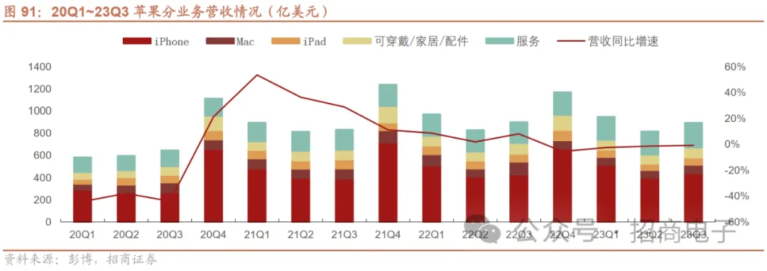 (1)苹果:23Q3略超预期, 23Q4(少并表一周)营收预计同比持平。苹果23Q3营收894.98亿美元,略高于市场预期(892.8亿美元),同比-0.7%环比+9.4%,下滑源于:1)受到超过2%的外汇逆风影响;2)全球宏观经济下行。净利润229.56亿美元,同比+10.7%环比+15.4%;摊销EPS 1.46美元,高于市场预期(1.39美元)。分业务看,1)iPhone:营收438.05亿美元,同比+2.7%,符合市场预期(438.1亿美元)。在新兴市场强劲增长的推动下,iPhone业务营收创下9月季度的历史记录,活跃安装基数达历史新高。2)Mac/iPad:Mac营收76.14亿美元,同比-33.83%,低于市场预期(86.3亿美元);iPad营收64.43亿美元,同比-10.1%,高于市场预期(60.7亿美元)。Mac与iPad的下滑均源自于市场竞争加剧、部分工厂关闭而导致的供应中断以及需求复苏缓慢。3)可穿戴/家居/配件:营收93.22亿美元,同比-3.3%,略低于市场预期(94.3亿美元),其中欧洲区创9月季新高,Apple Watch的新增用户占比约2/3。4)服务:营收223.14亿美元,同比+16.3%,超过市场预期(213.5亿美元)。App Store、广告、iCloud、视频、Apple Care和支付服务均创历史记录,Apple Music创9月季历史记录。美洲、欧洲、亚太地区创历史收入新高,中国大陆地区创9月季历史记录。源于:a)超20亿台活跃设备的安装基数持续增长,付费订阅超10亿驱动收入创历史记录;b)通过增加Apple Tv的内容以及增加iCloud的存储,持续改进服务的广度与质量。展望23Q4,苹果预计23Q4营收同比22年同期持平,源于:1)外汇对同比增长产生超过1%的负面影响;2)23年12月季只有13周,而22年有14周,如果加回这一周收入则实际能增长7%;3)iPhone收入将保持同比增长,Mac随着新品发布从9月份开始增长将大幅加速,iPad和可穿戴等设备收入同比表现将从9月开始大幅放缓,其中iPad未推出新品;4)服务业务将保持两位数的同比增速。苹果iPhone15新机销售在全球表现稳健,关注苹果MR+AI布局。在23Q3电话会上,库克表示目前iPhone 15 Pro和Pro Max在全球仍供不应求,预计23Q4末将实现供需平衡。对于Vision Pro,库克表示全球基于Vision Pro开发的应用正不断的涌现,期待24年年初Vision Pro的表现;而AI方面,苹果持续将AI技术应用于各核心产品中,正在投入相当多的资金,推进生成式AI的工作。如我们此前观点,苹果新机全球销售表现稳健,iPhone15新机备货中Pro系列需求及备货占比更高,搭载M3系列芯片的Mac新品发售亦将推动Mac在23Q4的市场表现,此外VisionPro亦进入备货期,24年初面向市场发售,有望开启未来数年空间计算设备及生态的发展机遇。