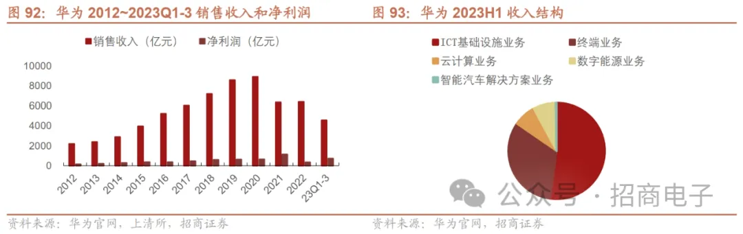 (2)华为:23Q1~23Q3利润高增长,预计2023年收入增长达9%以上,持续关注Mate 60/X5系列新机、智界/问界新车。华为前三季度总营收4566亿元,同比增长2.4%,净利率攀升到16%,根据销售收入乘以净利润率初步计算,2023年前三季度华为实现净利润达730.56亿元,这已超2022年全年净利润356亿元的两倍。据华为官微消息,华为轮值董事长胡厚崑表示公司经营基本回归常态。预计2023年实现销售收入超过7000亿元人民币,其中ICT基础设施业务保持稳健,终端业务好于预期,数字能源和云业务实现良好增长,智能汽车解决方案竞争力显著提升。新品方面,华为发布多款新车引发市场关注,Mate 60/X5系列手机携麒麟芯片重磅回归需求较强,详细分析可见新发布的《华为汽车产业链深度专题:多维生态赋能车企及供应链,探索Smart EV之界》及前期发布的《华为手机产业链跟踪报告:华为新机携麒麟芯片回归,关注产业链技术创新及国产替代》。