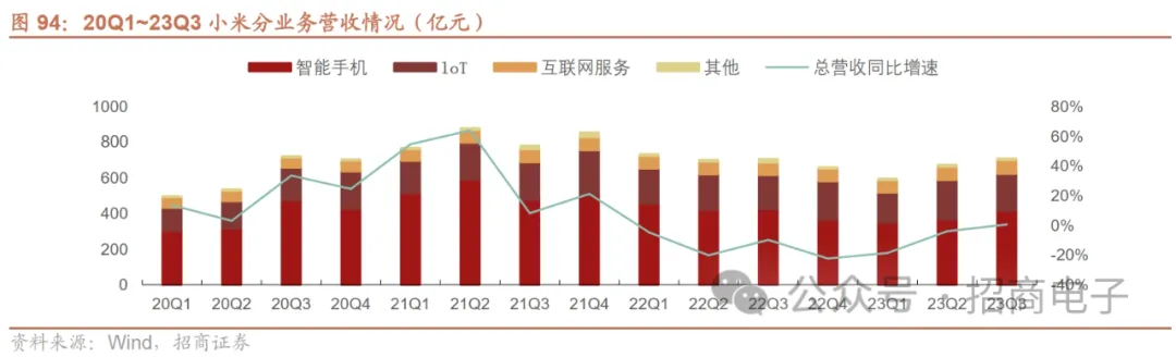 (3)小米:23Q3收入重回同比增长,盈利能力创历史新高,手机出货超预期,发布小米澎湃OS打造“人车家”全生态体系。23Q3总收入711亿元同比+0.7%环比+5.6%,营业利润50.1亿元,经调整净利润59.9亿元同比+182.9%环比+16.5%,单季度毛利率22.7%同比+6.1pcts环比+1.7pcts。1)手机业务:收入416亿元同比-2.0%环比+14%,毛利率16.6%同比+7.7pcts环比+3.3pcts。据Canalys数据,小米23Q3全球出货量超过4100万台,实现同环比增长,市场份额14%排名第三,达21Q3以来新高,率先受益全球市场复苏。小米进入23年以来在全球市场已实现连续三个季度的环比稳健增长,市占排名连续13个季度稳居全球前三。产品布局方面,小米持续推进高端化战略并取得阶段性的跨越。23M8小米发布折叠屏旗舰小米MIX Fold开售仅5分钟销量达到上一代的2.25倍,23M10发布的搭载全新操作系统“小米澎湃OS”的旗舰机小米14开售5分钟首销销量达小米13系列的6倍,显示出小米在高端市场的产品优势正逐渐在构建。2)IoT与生活消费产品业务:收入207亿元同比+8.4%环比-7.0%,毛利率17.8%同比+4.3pcts环比+0.3pct。小米正逐步将可穿戴、笔电、电视等业务部门并入手机部,此举将有望提升IoT产品之间的互联互通的协同性,进一步增强用户的产品使用体验。3)互联网服务业务:收入78亿元同比+9.8%环比+4.3%,其中境外收入占比同比+5.8pcts至30%,毛利率74.4%同比+2.3pcts环比+0.3pct。互联网用户规模持续增长,全球MIUI月活同增11%到6.23亿,智能电视全球月活超6400万。4)“小米澎湃OS”的发布是小米从“手机xAIoT”迈向“人家车全生态”的关键系统底座,未来小米将打通人、车、IoT底层架构,大幅提升产品交互体验。5)智能汽车方面,23M12小米汽车技术发布会上介绍了小米汽车的电驱/电池/大压铸/智能座舱/智能驾驶五大核心技术,首款车型SU7亮点颇多。6)AI方面,公司4月正式组建了AI实验室大模型团队,目前AI领域相关人员超3000人,已取得了不错的进展。小米60亿参数的自研大模型在C-EVAL权威榜单上取得同参数量级排名第一,小爱同学已升级大模型并开启邀请测试。公司不断深化前沿AI技术,推出XiaomiHyperMind思考中枢,通过全模态感知实现自动化执行,目前已实现实时字幕小爱输入助手、AI写真、AI妙画、AI搜图等基于AI大模型功能。