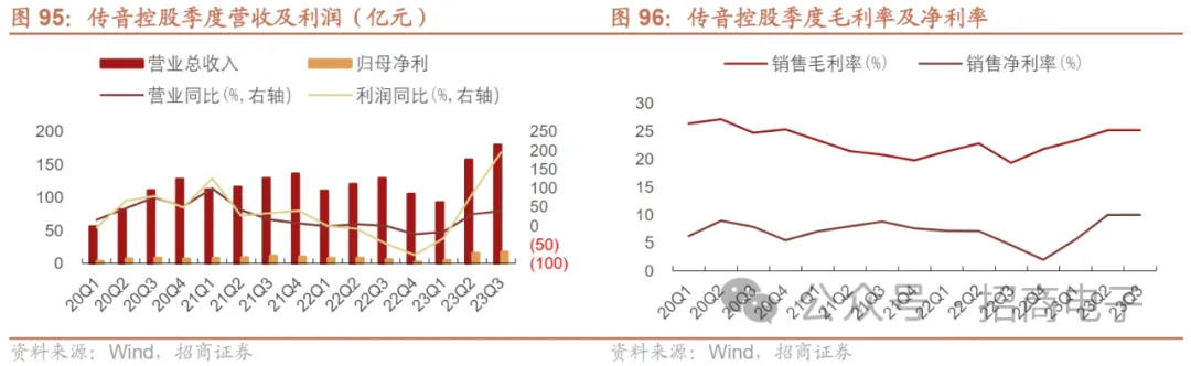(4)传音:2023年收入及利润均创历史新高,受益于新兴市场国家需求高景气,关注非洲以外新市场拓展进程。根据业绩预增公告,公司预计2023年实现营收约621.22亿元。同比+33.32%,归母净利润约54.93亿元,同比+121.15%,收入及利润均创历史新高,主要受益于新兴市场国家需求高景气,根据IDC统计,23Q3中东和非洲、拉丁美洲以及亚太地区(不包括日本和中国)等新兴市场的出货量分别增长了18.1%、8.2%和1.3%。公司在非洲市场依靠品牌、渠道、成本等优势保持龙头份额,同时在东南亚、拉美、中东等地区持续拓展市场份额,23Q4下游需求依然维持高景气。除此之外,公司依靠手机份额优势发展扩品类、移动互联业务,实现业绩的稳步增长,AI业务方面,公司正在陆续探索AI技术在手机工具类软件调度中的应用,未来有望打造垂直领域的AI模型,实现商业化应用。