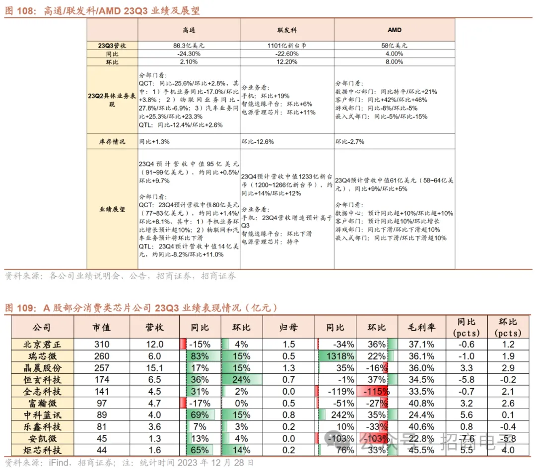 3、主芯片:国内SoC公司持续复苏,高通/联发科看好23Q4业绩前景手机:23Q3以来手机SoC市场需求企稳回升,终端及渠道库存稳定下降,联发科23M10/M11营收同环比持续增长,23Q4指引持续向好。受益于安卓手机终端及渠道库存持续去化、苹果及安卓多款新机发布带动拉货,23Q3手机SoC大厂如高通、联发科等普遍实现业绩环比高增长。联发科23M10/M11营收同环比持续增长,同比+28%/19%,环比+19%/0.6%。高通此前认为全球手机呈现需求稳定的早期迹象,预计2023年手机销量将同比下降中高个位数百分比,好于此前预期。联发科认为手机渠道库存几个月以来持续改善,库存周转天数已回归健康水平,预期未来几个季度将继续改善。联发科预计24年全球智能手机整体出货量增长低个位数,24年5G手机全球出货量有望同比增长双位数。
