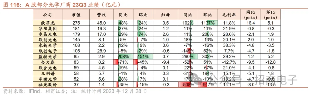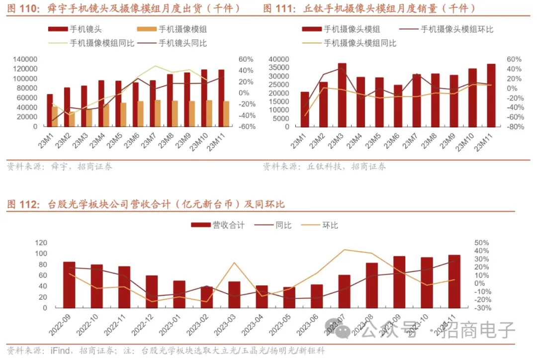 4、光学:消费电子景气回暖、终端库存去化带动业绩普遍回升 受益于安卓手机景气回暖、终端厂商库存去化及新机拉货需求带动,光学公司普遍迎来业绩复苏。例如大陆厂商中舜宇光学科技的手机镜头/摄像头模组出货量分别从23M5~M6恢复同比转正,三季度稼动率回升明显,23M10~M11同比持续高增长,23M11手机镜头出货117835千件,同比+29.3%/环比-0.1%,手机摄像模组51998千件,同比+49.9%/环比-3.8%。丘钛科技手机摄像模组受益于智能手机需求回升和公司高端模组发展良好驱动,23M10~M11出货34327/37094千件,同比+7.9%/6.5%,环比+12.4%/8.1%。欧菲光的摄像头模组也受益于下游大客户的拉货,订单逐步释放,23Q3营收、归母净利实现同环比高增长。中国台湾光学厂商23M8~M9营收同环比持续改善,23M10~M11同比增长依然强劲。大立光表示当前拉货高峰已过,23M12动能较23M11下滑,2023全年营收将逆转为正增长。玉晶光在法说会上表示23Q4营收有望创历年同期新高。