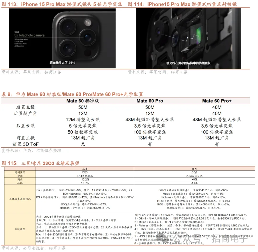 苹果、华为新机引领潜望式热度回归,关注潜望式、大像面、玻塑混合等光学结构性创新。苹果iPhone 15 Pro Max首搭潜望式摄像模组,采用四棱镜设计,可实现5倍光学变焦及25倍数字变焦,传感器相较14 Pro Max大25%。华为Mate 60系列3款手机均搭载后置潜望式长焦镜头,其中Mate 60 Pro/Pro+搭载更高像素和数字变焦能力的48M后置潜望式长焦,全焦段拍摄体验提升。苹果、华为的应用有望重燃国内安卓厂商对潜望式镜头的应用热度。除潜望式外,光学领域中大像面、玻塑混合、超薄化、大光圈、连续变焦等技术升级趋势渐成重点。