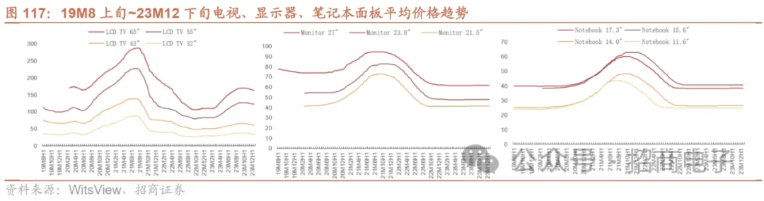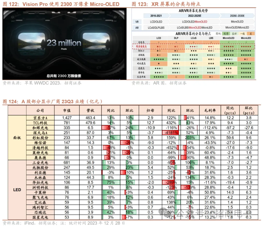 5、显示:23M12电视面板价格延续下跌趋势,关注中大尺寸产品OLED、XR端硅基OLED屏等应用趋势23M10下旬开始电视面板价格下跌,23M12电视面板延续下跌趋势,M12下旬部分显示器、笔记本面板价格下跌。TV面板方面,据WitsView,2023年以来,TV终端需求处于低位徘徊。为了面板价格能回归成本线且有所盈利,面板厂坚决贯彻实行低稼动率生产,灵活控产,加上部分韩厂和大陆中电熊猫产能的退出,面板供应量缩减,面板供不应求,拉动23M3~23M8电视面板价格逐月攀升,但23M9小尺寸电视面板无力续涨,大尺寸电视面板涨幅也收敛,23M10下旬小尺寸电视面板价格下跌,大尺寸面板价格维持不变。23M11电视面板价格全面走跌,23M12延续下跌趋势。显示器、笔记本面板方面,23M6~23M8下旬部分显示器、笔记本面板产品均价小幅上升,9月显示器各尺寸面板均价维持不变,部分笔记本面板均价小幅上升,23M10至23M12上旬显示器、笔记本面板价格维持不变,M12下旬部分显示器、笔记本面板价格下跌。