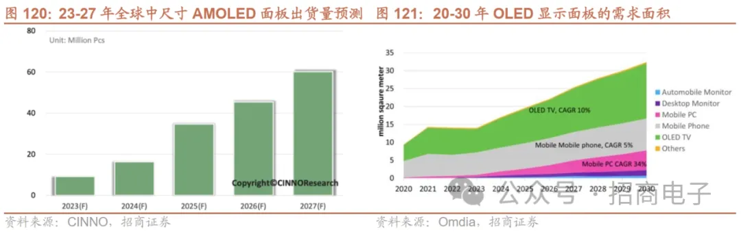 苹果2024年新款iPad Pro有望搭载AMOLED面板,关注OLED中尺寸应用趋势。CINNO Research预计苹果2024年将会推出采用AMOLED面板的iPad Pro产品,并且与Mini LED产品仅局限于12.9”一款产品不同,AMOLED面板版本将覆盖11”和12.9”两款iPad Pro产品,到2026年iPad Air和Mini系列也将更换为AMOLED面板,有望拉动AMOLED中尺寸面板的需求量明显增加。据CINNO Research数据,2022年全球蒸镀AMOLED IT面板出货量超900万片。此外,韩国LGD等面板企业也在利用自身技术与产能优势,积极布局车载产品,2022年全球车载显示领域蒸镀AMOLED产品出货量亦约80万片。到2027年,IT与车载应用蒸镀AMOLED产品出货量预计有望达到5240万片与780万片,合计6020万片。据Omidia,2022~2030年,OLED显示面板的需求面积CAGR将达到11.0%。各大品牌正逐步将OLED显示面板应用于电视、手机,以及笔记本电脑和平板电脑等更广泛的消费电子产品高端系列中。京东方拟投资建设8.6代OLED产线,打开中尺寸成长空间。23年11月,京东方发布公告拟投资建设第8.6代AMOLED生产线项目,这也是国内首条8.6代AMOLED生产线。项目建设周期约34个月,总投资630亿元,设计产能每月3.2万片玻璃基板,主要生产笔记本电脑、平板电脑等高端触控AMOLED显示屏。该项目预计将有效满足日益增长的IT类AMOLED显示屏的市场需求,推动AMOLED显示产业快速迈进中尺寸发展阶段。近年来,随着AMOLED技术在手机应用站稳脚跟,渗透率不断上升,韩国三星率先推出面向IT应用的中尺寸AMOLED产品,国内各大面板厂也紧随其后,纷纷布局中尺寸市场,并将之视为未来发展重点。