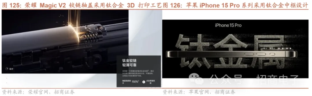 6、结构及功能件:关注下游需求复苏表现,中长期钛合金及微晶玻璃等创新趋势结构件及功能件行业目前整体产能仍供大于求,23H1在消费需求疲软、行业去库存的背景下,结构功能件厂商竞争持续加剧,价格及盈利能力不断承压,进入23Q3伴随新品周期,行业需求有所回暖,厂商业绩普遍迎来环比改善。23Q3国内结构功能件厂商业绩表现多数同比仍下滑,但环比已呈现较大改善迹象。展望23Q4,据产业链跟踪情况,目前下游新品需求较为旺盛,终端库存已进入相对健康水位,多数厂商稼动率环比持续提升,行业整体盈利情况有望得到进一步恢复。但对于24年需求,多数厂商看法偏谨慎乐观。金属件方面,23Q3消费电子新品备货需求推动业绩环比改善,多数厂商积极切入汽车电子赛道以及布局钛合金领域。结构件主要厂商:富士康、立讯精密、捷普、比亚迪电子、长盈精密、春秋电子、精研科技、胜利精密、科森科技、福立旺等。其中立讯精密旗下控股子公司立铠精密为A客户金属结构件及Top-module的核心供应商,22年立铠实现营收741.87亿元,净利润20.01亿元,近年来持续提升其在A客户供应链中的份额以及扩充新品类,未来有望保持较快增长趋势。比亚迪电子为安卓消费电子结构件头部厂商,近期拟收购捷普手机结构件业务,进一步加码A客户产品布局,并有望在钛合金材料领域获得卡位优势,同时积极布局汽车Tier1、户储等业务,24年盈利能力有望持续改善。长盈精密近两年在“双调整战略”的推动下,A客户笔电平板金属机壳业务份额稳步提升,同时亦是A客户MR金属件核心一供;在非A消费电子方面,公司亦具备完整钛合金加工能力,有望伴随钛合金材料在下游安卓厂商智能硬件中的应用得到新的成长空间;此外,公司在新能源汽车领域产能稼动率持续提升,卡位头部核心客户,未来有望迎来盈利改善,获得业绩弹性空间。苹果、荣耀等厂商逐步引入钛合金材料,将加速钛合金在消费电子结构件中的应用。钛合金在高强度、轻量化、耐腐蚀性等方面较和铝、不锈钢等材料具备显著优势,有助于消费电子终端的轻薄化、便捷性和耐用性。而钛合金因材料的硬度较高,采用传统CNC工艺加工时较长、效率及良率较低,目前单机ASP普遍高于铝和不锈钢材料。而在结构复杂、物理空间更小的可穿戴产品中采用3D打印+CNC工艺是目前钛合金加工路线中可选的方案之一。荣耀 23年7 月 12 日发布的荣耀 Magic V2,是全球首款采用钛合金铰链的折叠旗舰机,铰链的轴盖部分首次采用钛合金 3D 打印工艺。卷轴的轴盖是影响折屏厚度的关键,钛合金技术可以让轴盖变得更轻更薄,相比铝合金材质的强度提升了150%,铰链宽度降低27%,而且更韧、更耐腐蚀。苹果已累计获得钛合金材料相关专利8项,23年9月发布的Apple Watch Ultra 智能手表的钛金属结构件已部分采用3D打印工艺, iPhone 15Pro系列亦采用钛金属中框替换之前的不锈钢材料,使得重量进一步减轻,使用体验得到优化。小米23年10 月 26 日发布小米14系列,其中特别版采用了钛金属中框。三星:据产业链消息,三星预计于24年初或将在Galaxy S24 Ultra采用钛合金中框设计,重量有望进一步降低。
