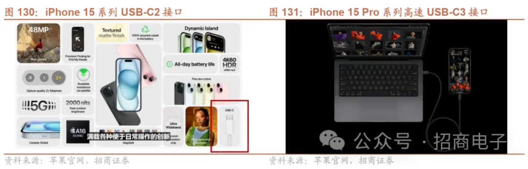 7、充电/连接:iPhone改用Type-C接口,汽车智能化带动高速连接器需求①充电:苹果iPhone15全系改用Type-C;华为发布“新一代全液冷超充架构”1)手机:苹果设备间接口进一步统一;华为Mate 60系列续航+快充再升级苹果iPhone15及15 Pro全系改用Type-C接口,未来有望向无线充电过渡。2023年9月,苹果宣布iPhone15系列采用USB-C 2接口,iPhone15 Pro系列采用高速USB-C 3接口,数据传输速度大幅提升,与USB2相比,传输速度提升20倍以上。据彭博社,预计2024年之前普通AirPods、AirPods Pro和AirPods Max的下一个版本都会引入USB-C接口。未来iPhone可能直接取消充电接口的设计;除iPhone、Apple Watch、AirPods外,苹果还计划将iPad过渡到无线充电。