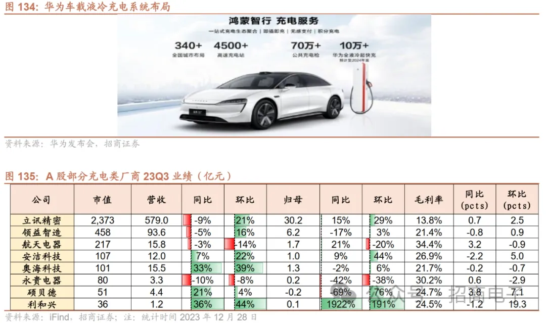 其他国产手机也在快充领域持续突破,最高功率可达240W。目前大部分旗舰手机首选120W快充,如小米14Pro;一加Ace 2 Pro搭载150W闪充方案,6分钟左右电量即可充至一半,提速明显;200W以上的代表机型则为iQOO 11 Pro和真我GT Neo5,分别能实现200W/240W的闪充功率,其中真我GT Neo5不到10分钟即可满电,是目前已实现商用的充电最快的智能手机。2)汽车:华为发布“新一代全液冷超充架构”,预计到2024年华为全液冷超充将部署超过10万个23年4月华为发布“新一代全液冷超充架构”的充电网络解决方案。产品具有全液冷、全模块化、融合光储、超快一体的特点。23年10月华为数字能源助力打造“318川藏超充绿廊”全液冷超充站上线,可实现1)充电更快,“一秒一公里”。最大输出功率600kW,远高于特斯拉(V2超充桩峰值250kW)、保时捷(800V超充峰值270kW)等的功率范围。2)匹配所有车型,来车即充。支持200-1000V充电范围,覆盖全功率段车型,包括特斯拉、小鹏、理想等乘用车及货拉拉等商用车。截止23年11月底,鸿蒙智行在全国340+个城市布局充电服务支持,提供4500+高速充电站、70万+公共充电桩。余承东预计到2024年年底,华为全液冷超级快充将部署超过10万个。