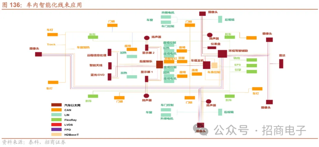 ②连接:多传感融合趋势及AI大模型陆续上车,促进高频高速连接器的车内应用。1)自动驾驶:AI大模型对于多模态感知的处理能力更强,有望更好促进多传感器融合的应用,数据量呈指数级提升驱动车用高速连接器的需求增加。2)智能座舱:大模型陆续接入车载语音助手,人机、车机交互功能带来车端通信连接器和电连接器的用量提升。如问界新M7/智界S7中依托盘古大模型的AI语音即将上线,23M12理想同学引入Mind GPT能力,23M10上市的吉利极越01整合了百度的AI大模型文心一言和Apollo智能驾驶系统等。