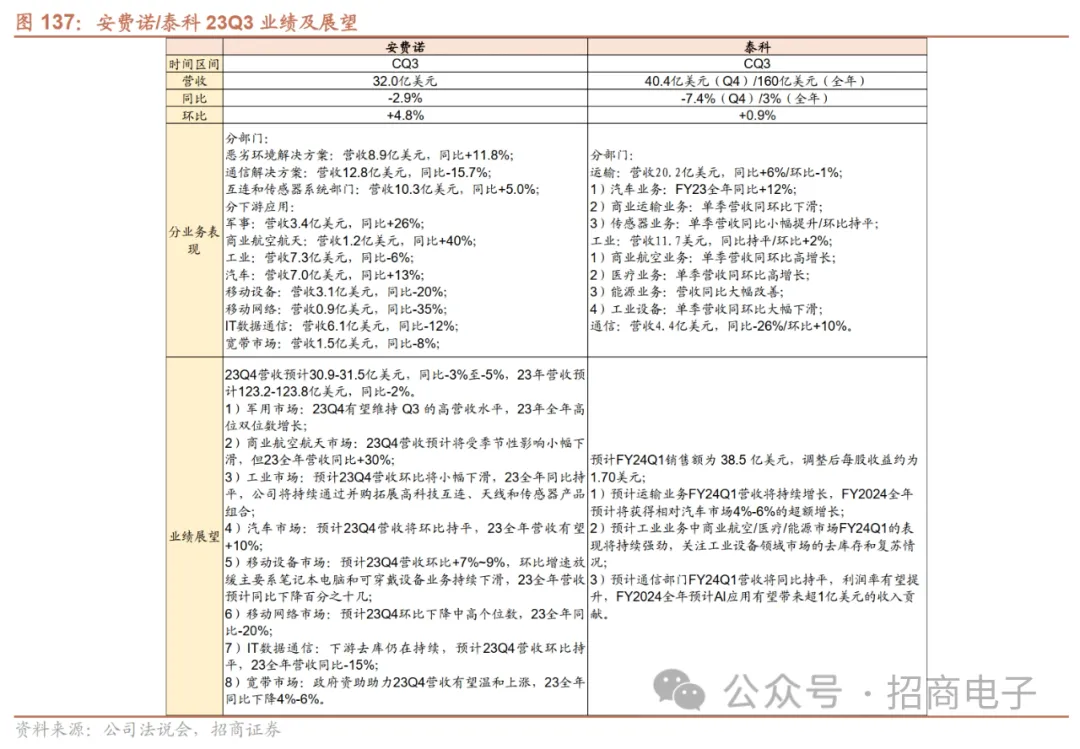 泰科:汽车业务单季营收同比高增长;受益于汽车电动化及公司定价优势,预计FY2024汽车业务超额增速4%-6%。公司FY23Q4(7.1-9.30)收入40.4亿美元,同比-7.4%/环比+0.9%,符合此前指引,其中运输/工业/通信部门收入占比分别为60%/29%/11%。运输部门营收实现同比增长,单季度订单量同环比提升,主要受益于终端混动和纯电动汽车的产量持续增长。公司电动汽车上的产品内容应用约为燃油车上的2倍。公司预计24年每季度汽车产量约2100万辆,其中混动和纯电占比将持续提升,未来亚洲地区仍将为电动汽车业务的增长动力源。受益于公司与中国市场合资及本土OEM的广泛合作,预计公司在电动汽车领域将持续增长。安费诺:移动设备市场业务环比大幅改善,汽车市场需求保持强劲,预计23Q4移动设备营收环比持续提升。23Q3公司营收32.0亿美元,高于指引上限,同比-2.9%/环比+4.8%,同比下滑主要系商用航空、军事和汽车市场的增长及公司收购对业绩的贡献被IT数据通信、移动网络、移动设备、宽带和工业终端市场的下滑抵消。公司预计23Q4移动设备、宽带业务有望环比提升,但移动设备业务受笔记本和可穿戴业务下滑影响环比增速放缓。预计23Q4汽车业务环比持平,23全年营收+10%。
