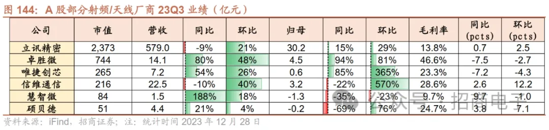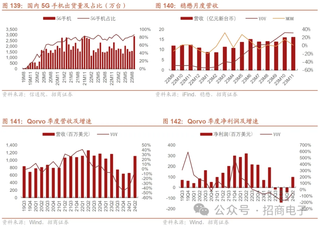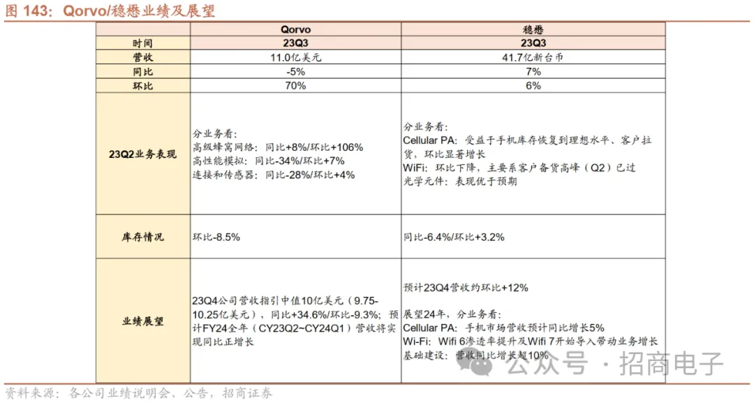 8、射频/天线:手机射频相关需求回温,关注国内龙头LPAMiD新品进展2022~23Q2终端客户持续去库,23Q3客户端库存接近正常水位,国内外厂商营收环比回暖,23Q4景气度亦有望持续回升。目前安卓智能手机厂商库存已接近历史正常水平,受益于渠道库存去化、新机拉货带动需求改善,海外龙头23Q3普遍出现稼动率提升、毛利率和营收环比增长。1)稳懋:23Q3营收41.65亿元新台币,同比+7%/环比+6%,产能利用率从23Q2的40%提升至23Q3的50%左右。23M10/M11公司营收同环比持续增长。公司认为下游客户需求逐渐回升,预计23Q4营收将实现环比低两位数百分比的增长。2)Qorvo:23Q3营收及利润率均超指引,库存周转天数环比下降,23Q3稼动率有所提升,但仍低于历史水平。公司预计23M12季度智能手机市场需求将迎来季节性高增,未来几年安卓5G手机的出货量将保持低两位数增长。伴随终端景气复苏、公司稼动率和产品组合改善,预计23Q4营收及毛利率价将同比上升,未来毛利率将逐渐恢复至50%以上。此外,Qorvo公布其在中国的两座封装及模组工厂为立讯精密所收购。