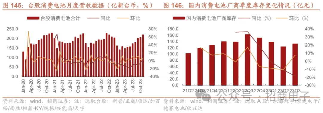 9、电池:行业温和复苏,关注供应链格局变化以及电池创新技术趋势 消费电池行业23H1受下游终端需求影响,去库承压,23Q3迎来补库叠加季节性回暖,中长期消费电池行业增长动能源于可穿戴设备、XR、AIoT等新兴电子领域的需求,传统3C增长或将持续放缓。从中国台湾消费电池厂商月度数据来看,23Q3合计营收553.7亿新台币同比-10.1%环比+20.8%,23年10/11月营收205.7/219.4亿新台币同比-6.0%/+5.1%环比+2.2%/+6.7%,行业需求边际回暖带动营收同环比增长。库存方面,以国内消费电池厂商来看,23Q3库存同比-18.4%环比+7.4%,23H1消费电池环节库存持续去化进入相对低位,Q3新品拉货需求推动库存回升。