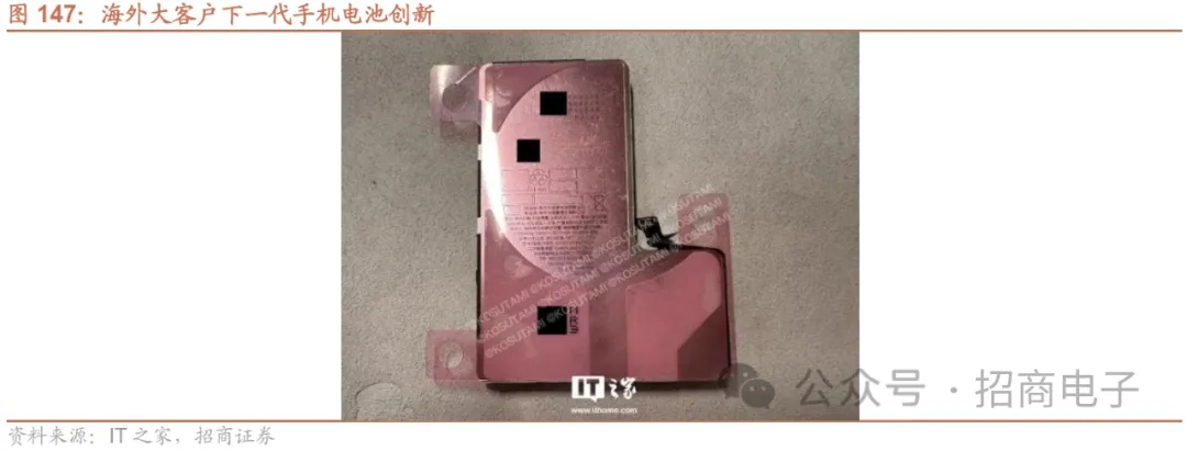消费电池行业近几年呈现由“A+B”逐步向“A+A”的模式转变,由此带来电芯及PACK环节的格局持续变化。“A+B”模式意味,终端厂商将电池供应链环节分为电芯和PACK两个独立环节去引入供应商;而“ A+A”模式则是由一家电池厂商同时完成电芯和PACK两个环节,垂直一体化更强。近几年我们可以看到,以欣旺达、德赛电池为代表的PACK厂商通过不同的方式在积极地向上游电芯环节延伸,而珠海冠宇等电芯厂商则通过强化PACK能力进一步扩大规模,提升在终端客户的份额。电芯环节呈现“日韩战略转型逐步退出,国内厂商加速崛起”的局面,整体竞争格局较佳。目前全球消费电芯市场格局方面,ATL(TDK旗下全资子公司)占据约40%、日韩厂商(松下/三星SDI/LG化学)合计占据25%、珠海冠宇占据15%左右。我们认为目前电芯环节呈现边际向好趋势,上游电池主材降价带来成本端的优化,行业库存在23Q2已见底,叠加新品拉货带动稼动率提升,有望推动电芯厂商盈利能力逐季恢复。此外,日韩电池厂商在战略转型动力储能领域下将逐步退出消费电池市场,市场份额有望被国内具备技术、产能优势的厂商,如珠海冠宇等承接。关注海外大客户下一代电池创新趋势。据IT之家,海外大客户或将在下一代手机中使用石墨烯散热,手机电池采用金属制外壳,从而提供更好的散热性能;钢壳电池可拆卸性增加,方便用户更换电池从而延长手机使用寿命,此外亦有效解决热膨胀问题,提升手机使用安全性。据产业链信息,于此前异形叠片软包电池相比,新一代钢壳电池设计方案有望大幅提升单价ASP。