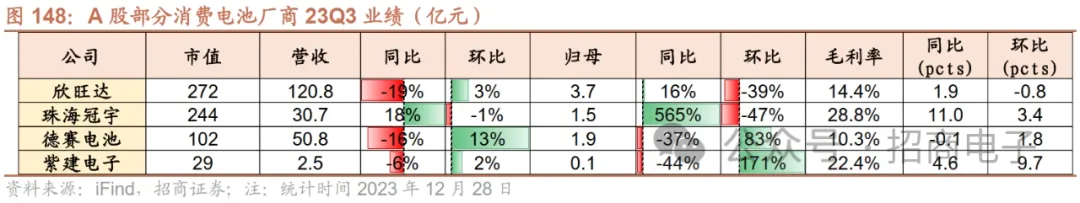 珠海冠宇:23Q3业绩符合预期,盈利能力持续改善。公司23Q3实现营收30.7亿元同比+17.9%环比-1.0%,归母净利1.5亿元同比+564.9%环比-46.8%,扣非净利1.2亿元同比+295.5%环比-52.5%,毛利率28.8%同比+11.0pcts环比+3.4pcts,净利率3.2%同比+11.0pcts环比-5.1pcts。23Q3公司盈利水平大幅改善,源于原材料价格下降、产能利用率提升等因素。展望23Q4,NB需求仍有望延续,未来若AIPC应用逐步落地或将推动行业进入新一轮换机周期,则有望带来弹性成长;且公司在苹果手机产品持续导入,份额快速提升,潜在利润增量值得期待。而动力储能领域,公司启停电池在下游国内外众多头部主机厂取得定点并陆续供货,储能业务与南网科技达成深度合作,且大储电芯已进入国标认证阶段,预计24年逐步放量,稼动率提升带动亏损收窄,有望打开新的成长空间。中长期,公司在A客户电芯环节竞争格局极佳,份额及品类持续增加,且有望配合A客户在下一代钢壳电池持续导入,带动单机价值量显著提升;而在手机市场公司有望持续提升市占率,具有潜在成长空间。PACK环节格局相对稳定,国内厂商份额望稳中有升。目前消费电池PACK环节主要厂商为欣旺达、德赛电池、新普、NVT等,占据了绝大多数的市场份额。其中德赛电池在A客户中的份额较高,保持主供地位,德赛23Q3收入50.8亿同比-15.7%环比+12.8%,归母净利1.9亿同比-37.4%环比+83.3%,扣非归母净利1.8亿同比-36.9%环比+73.3%,毛利率10.3%同比-0.1pct环比+1.8pcts,净利率3.6%同比-1.4pcts环比+1.5pcts,23Q3盈利能力环比改善。展望23Q4,公司主供苹果新机Pro系列,产能稼动率维持在较高水平,且在BMS SIP业务持续导入苹果、小米、华为、荣耀等客户,储能业务持续推进,单季度业绩有望延续改善趋势。欣旺达不断在新能源领域发力,消费电池持续导入新客户,整体收入体量有望保持快速增长。