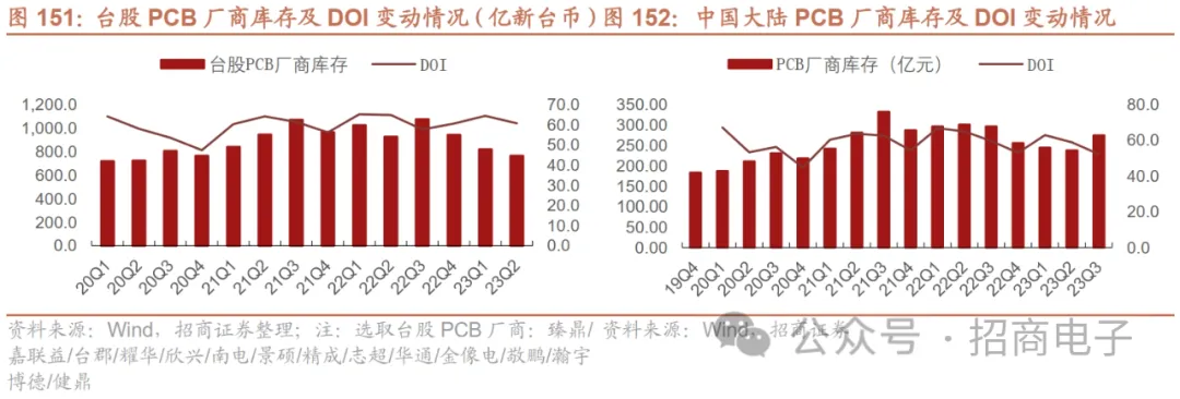 库存方面,中国大陆PCB厂商库存23Q3环比提升,周转继续下降。23Q1/Q2/Q3大陆PCB厂商库存环比-4.4%/-2.8%/+15.5%;台股头部PCB厂商库存环比-13.5%/-3.5%/+11.3%,23Q3环比增速均大幅转正,显示库存较大程度去化后有一定回补。中国大陆及中国台湾PCB板块库存周转天数在库存水位持续下滑以及新品备货的背景下环比向下改善。产能利用率情况,进入23Q3国内厂商整体产能利用率表现持续改善趋势。据各厂商最新的跟踪情况,进入23Q3新品备货季,叠加下游库存去化较大后的补库需求,多数厂商产能利用率已恢复至在80%以上,呈现稳步改善趋势,下游订单能见度普遍在1-2个月。