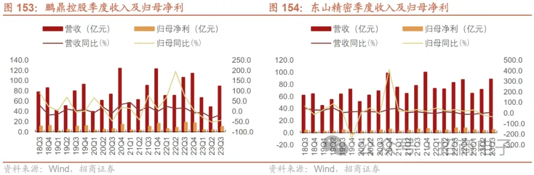 苹果链软板需求短期承压,23Q4新品备货望推动业绩边际好转。鹏鼎控股:23Q3盈利承压,主因客户订单需求疲软、新品备货延后以及汇兑收益大幅缩减。公司23Q1-3收入204.56亿元同比-17.49%;归母净利 18.44 亿元同比-43.50%;扣非归母净利17.71亿元同比-44.39%,毛利率20.28%同比-2.32pcts,净利率9.02%同比-4.15pcts。23Q3单季度收入89.20亿元同比-15.85%/环比+83.24%;归母净利10.32亿元同比-43.82%/环比+162.50%;扣非归母净利10.31亿元同比-43.30%/环比+206.93%;毛利率22.84%同比-3.89pcts/环比+8.09pcts,净利率11.57%同比-5.76pcts/环比+3.49pcts。23Q3季度 7-8 月份处于大客户新旧产品过渡期且需求淡季,进入 9 月大客户新机备货有一定的延后,整体稼动率水平较低,且 miniled 硬板产能受下游客户需求下滑,新增客户订单短期无法对冲,造成收入端以及毛利率均有所下滑。此外,23Q3 汇兑收益较22年同期有较大下滑,对于盈利亦有负面影响。23M10/M11公司收入44.6/40.1亿元同比-1.5%/+23.46%,显示公司大客户新机需求表现相对稳健。东山精密:23Q3业绩短期承压,下滑主因光电显示板块拖累,核心客户新品项目延后。公司23Q1-3营收225.01亿同比-1.39%,归母净利13.33亿同比-15.69%,扣非归母10.37亿同比-28.86%,毛利率13.97%同比-2.67pcts,净利率5.92%同比-1.00pct。单看23Q3,营收88.34亿同比+6.78%环比+23.45%,归母净利5.08亿同比-35.22%环比+43.99%,扣非归母4.59亿同比-41.10%环比+54.28%,毛利率14.81%同比-5.66pcts环比+2.63pcts,净利率5.75%同比-3.74pcts环比+0.81pct。23Q3收入同比增长源于:1)苏州晶端车载显示业务并表贡献;2)T客户以及A客户业务保持增长态势;3)LED及触控模组业务同比有增长。业绩承压源于 1)LED 业务 23Q3 仍处于亏损状态;2)A 客户新品订单较同期有一定后延以及;3)23Q3汇兑收益较22年同期贡献较小。伴随下半年iPhone15(潜望式镜头、钛合金、更窄边框、USB-C、3nm芯片和UI交互升级等创新)、Mac(M3系列芯片)、Watch更多新品发售,上游供应链已进入新品备货期,预计23Q4果链PCB板块将迎来业绩恢复,目前鹏鼎东山股价及估值均进入历史低位,中长期我们认为苹果发布的MR产品VisionPro将对供应链注入未来增长动能,鹏鼎/东山核心配套该款产品、单机供货价值量仅次于手机、接近iPad,且在大客户创新带动下,整体产品矩阵的使用体验和市场空间有望进一步打开。