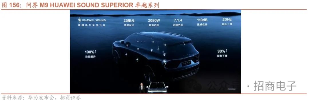 11、声学/马达:华为SOUND卓越系列首发问界M9,苹果Vision Pro搭载单目IPD调节及空间音频汽车:华为声学黑科技落地问界M9,软硬件结合打造座舱音频新体验。华为自研的HUAWEI SOUND SUPERIOR卓越系列首次上车,硬件方面搭载25扬声器+2080W超强功放+星环散射体,可实现100%功放提升、33%低音下潜、剧院级声学技术上车。软件方面搭配华为领先的技术与算法,实现独创隐私声盾、超感空间音、智慧甜点位等功能,其中隐私声盾可屏蔽90%二排对话信息。