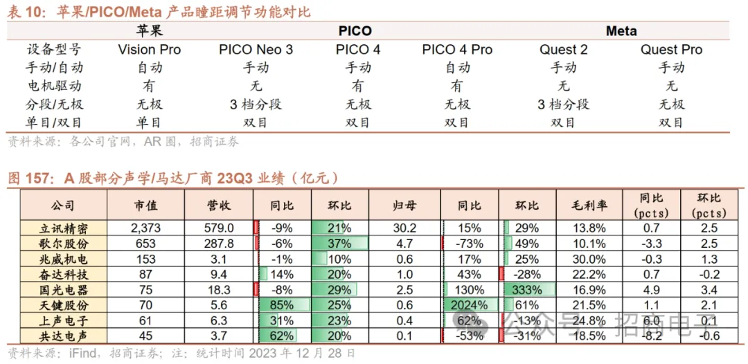 MR:1)IPD调节:苹果Vision Pro配备无极瞳距调节模组,未来有望配备屈光度调节功能。苹果 Vision Pro采用单目无极瞳距调节模组,能够分别检测左右镜头模块与用户鼻子间的相对位置,并实现基于眼动追踪下的自动调节。未来苹果XR头显有望实现屈光度调节功能,进一步改善近视、远视、散光人群的佩戴体验。2)音频:苹果Vision Pro采用全新空间音频技术,可以为用户提供个性化的空间音频。Vision Pro耳朵两侧的音频组件各有一组双驱动单元,根据用户的头部及耳朵形状定制的个性化空间音频。同时Vision Pro配备音频射线追踪,可同感分析空间的材质和特征,精确提供最适合的音频表现。