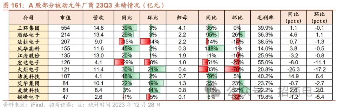 国内大厂23Q3复苏显著,主要受益于消费电子等终端景气复苏、产能利用率提升。1)三环集团:23Q3业绩同比高增长,公司高容量、小尺寸MLCC研发进展顺利,车载MLCC已过车规体系认证,陶瓷插芯、片式电阻器陶瓷基板技术水平持续升级。公司陶瓷背板业务下游需求呈复苏态势,未来伴随稼动率提升及高容产品出货有望带动整体营收持续提升。2)顺络电子:23Q3营收及净利润同环比提升,主要受益于消费电子订单回暖、产品结构优化等因素,关注公司LTCC、一体成型电感等新品和汽车电子等新领域拓展。3)风华高科:23Q3营收级归母净利同比高增长,主要系22年同期基数较低、23年行业景气有所复苏所致。公司23Q3稼动率不断回升,新增12个规格高端MLCC交付生产、输出4款关键材料、祥和项目良率大幅提升,关注高端化布局进展。4)洁美科技:23Q3营收及归母净利同环比提升,主要系下游MLCC行业需求复苏。公司下游MLCC库存逐步正常化,下游订单拉动稼动率提升。公司中高端规格离型膜产品验证已取得一定突破,韩日系大客户验证及小批量试用稳步推进,有望随终端需求复苏实现成长。