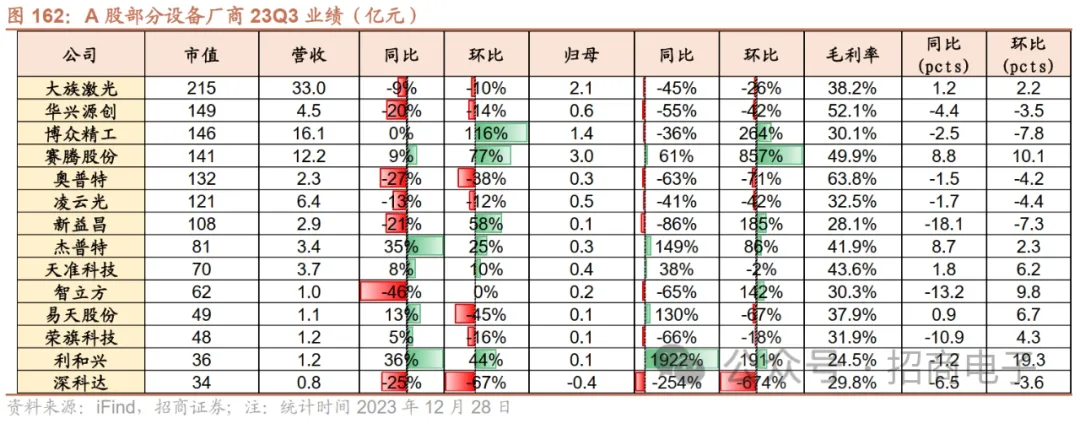 13、设备:3C设备短期景气度承压,关注XR/钛合金等新技术趋势下的结构性看点3C设备短期景气度承压,关注XR/钛合金等新技术趋势下的结构性看点。23Q3宏观经济等因素导致消费电子、新能源光伏和储能等需求不振,23Q3大族激光、奥普特等设备厂商业绩普遍承压。但行业长线成长逻辑及国产替代趋势依旧清晰,老龄化及技术发展驱动智能制造升级,AI亦有望拓展机器视觉应用领域,同时XR等终端创新有望带来新的增长空间。我们建议关注XR/钛合金创新趋势下的设备厂商机会:1)XR:苹果Vision Pro有望开启未来数年空间计算的发展机遇,如后续销量超预期,可关注设备链条相关厂商;2)钛合金:钛合金凭借高强度、轻量化、耐腐蚀性等特性,苹果、荣耀等厂商逐步引入钛合金材料。大族激光:下游需求承压,静待下游景气度回归。公司23Q3营收33.01亿元,同比-8.96%环比-9.86%,归母净利润2.09亿元,同比-45.37%环比-25.83%,扣非归母净利润1.69亿元,同比-19.85%环比-29.57%,毛利率38.17%,同比+1.22pcts环比+2.19pcts,净利率7.31%,同比-3.61pcts环比-1.26pcts。公司业绩承压主要系受下游需求疲软影响,客户设备投入有所放缓和延期。展望未来,静待公司下游需求复苏,新业务成长空间可期。分业务看,公司下游PCB、消费电子等需求有望迎来复苏,公司围绕客户需求持续推出高阶PCB等新产品,并有望受益于下游客户的产能转移;新能源业务方面,公司与宁德时代、中创新航、亿纬锂能、欣旺达等客户的合作不断深入,并加快出海进程,抓住新能源市场发展的全球化发展机遇。同时,公司高功率激光焊接、Micro-LED、第三代半导体等新兴业务有望逐步起量,贡献长线成长增量。奥普特:下游需求承压,静待行业景气拐点。23Q3营收2.27亿元,同比-26.69%环比-38.49%,归母净利润0.31亿元,同比-63.04%环比-71.18%,扣非归母净利0.24亿元,同比-68.69%环比-76.25%,毛利率63.77%,同比-1.50pcts环比-4.16pcts,净利率13.73%,同比-13.51pcts环比-15.58pcts。23Q3收入同比下降主要系下游3C和锂电需求疲软,盈利能力下降主要系公司毛利率有所下滑叠加加大研发投入、员工人数增长导致期间费用率同比有所提升。展望未来,宏观经济复苏或将带动下游需求复苏,公司有望随着下游需求向好恢复快速增长。
