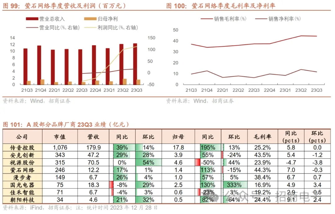 (6)萤石网络:23Q3利润延续同比高增,23Q4有望延续基本面逐季向上趋势,扫地机等新品扩张+云平台共筑成长。公司23Q3营收12.23亿,同比+17.00%环比+1.49%,归母净利1.43亿,同比+112.55%环比-14.61%。23Q3营收及利润符合我们前期判断的同比增速逐季向上趋势,主要系受益于智能家居下游需求回暖及公司新品扩张、云业务快速发展。其中,利润同比高增我们认为主要得益于硬件产品原材料成本下降、高毛利率云平台业务占比扩大、线上渠道快速建设,带动23Q3延续Q2高毛利率表现;以及22年同期利润基数较低。展望23Q4,考虑到22年同期基数较低,以及公司智能家居新品扩张及需求回暖、云业务快速发展,23Q4有望延续基本面逐季向上趋势。我们认为公司智能家居产品矩阵持续完善,同时具有深厚的音视频AI算法技术沉淀,其中摄像机有望延续领先地位;门锁等智能入户产品有望凭借视频和视觉技术优势,获快速增长;公司依托自身AI能力,亦布局扫地机、C端具身智能机器人等新品,23M10中新发布B端BS1清洁机器人,摒弃传统激光雷达实现纯视觉算法,价格具备竞争力,并面向C端推出AI扫拖宝RS20 Pro,具备多项AI功能。此外公司推出多模态3D数字人,有望进一步驱动公司云业务发展,目前云平台业务规模较低但盈利能力突出,随着公司云平台接入设备数、用户数量增加,有望带来更高利润贡献。
