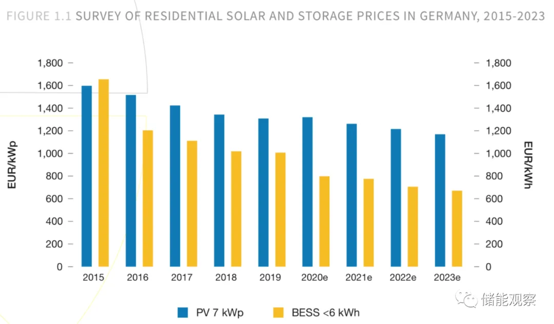 以欧洲最大的太阳能和储能市场德国为例,2015-2019年间,小型太阳能系统的价格下降了约18%,家用储能解决方案的价格下降了近40%(见图1.1)。在2023年之前的未来几年,成熟的住宅太阳能系统价格预计将进一步下降10%,而更年轻的BESS价格将大幅下降33%。