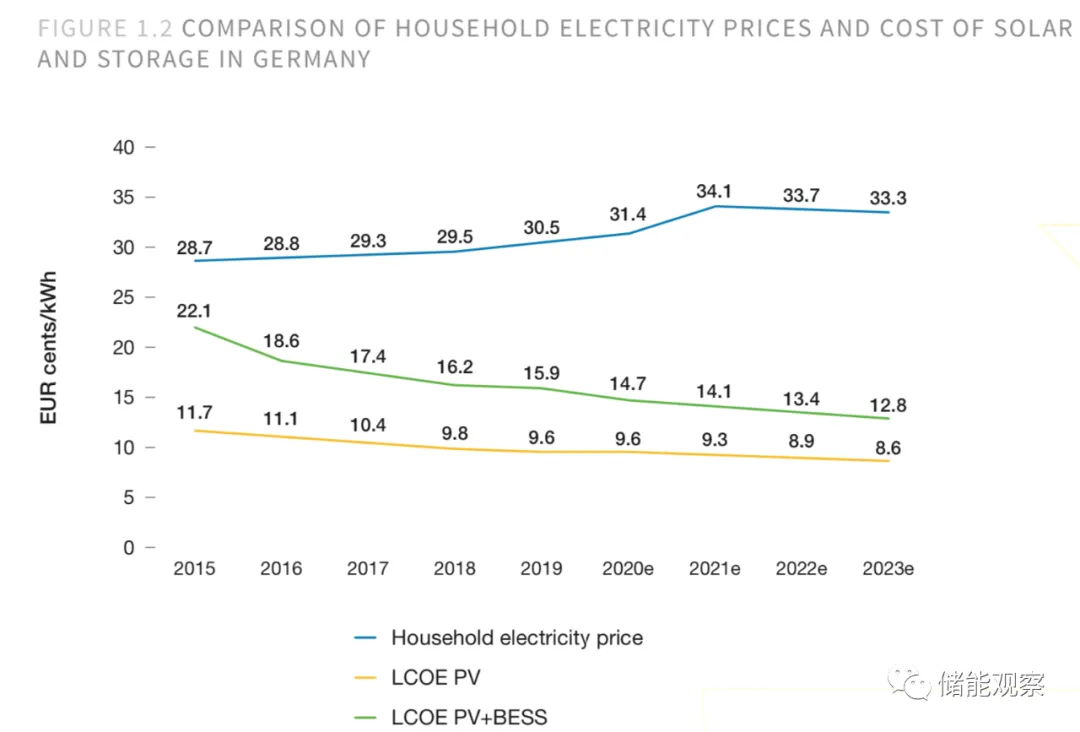 电池储能的快速降本使得太阳能+储能在越来越多的欧洲国家击败了传统电网电力。在德国,一流的太阳能+储能系统目前的LCOE达到14.7欧元/千瓦时,这几乎是典型电价的一半(见图1.2)。