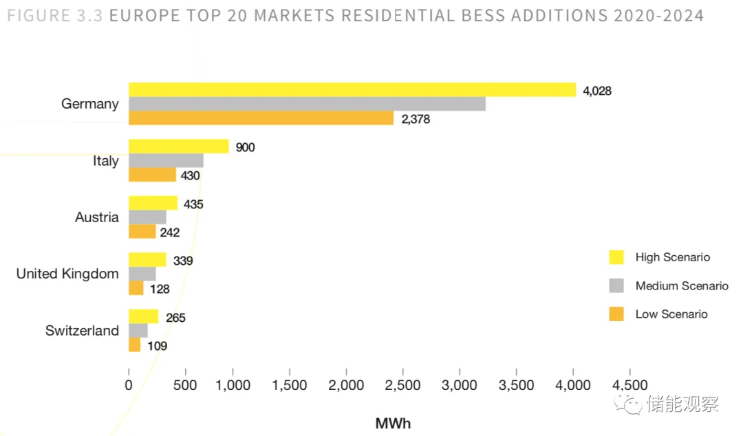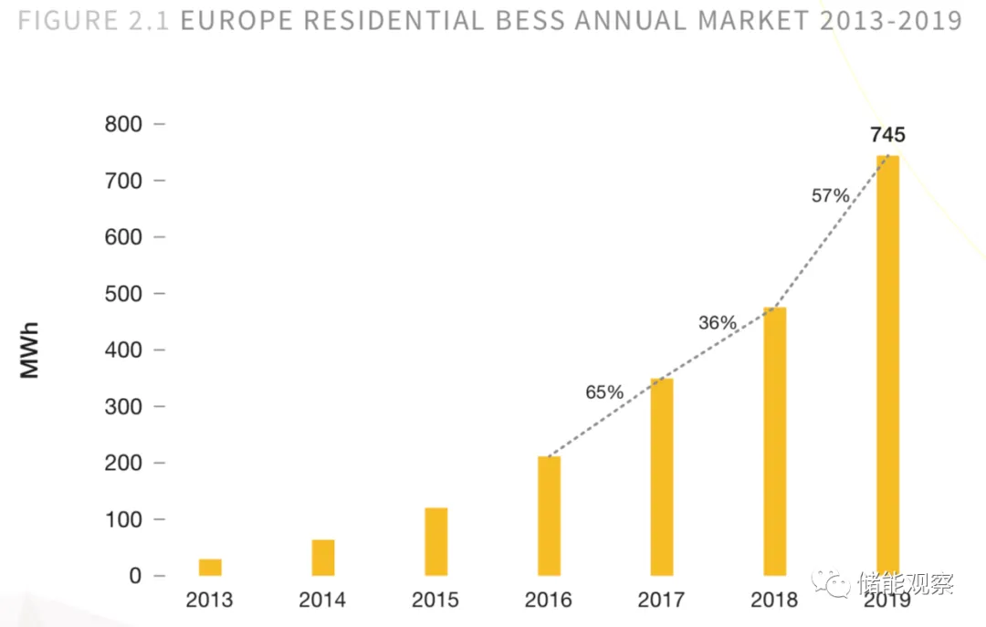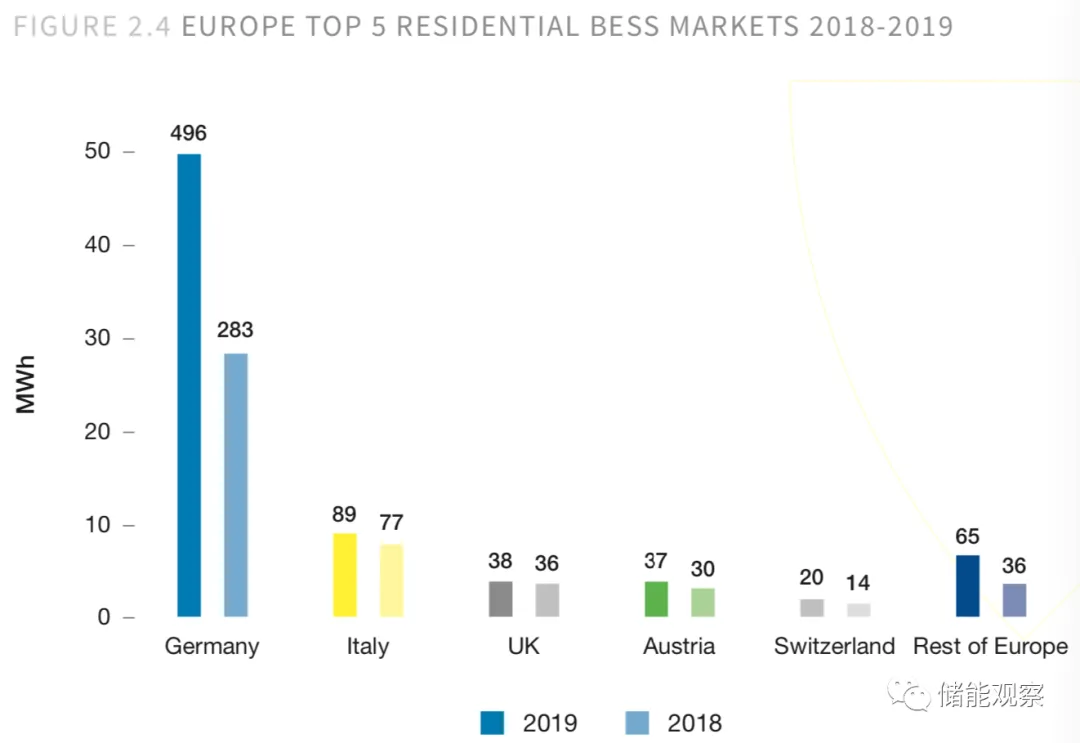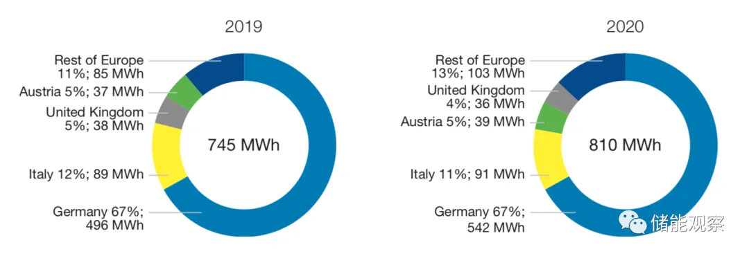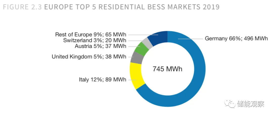 市场调查显示,欧洲家用电池增长强劲。2019年,共安装了96000个系统的745 MWh电池容量,同比增长57%。其中,有德国、意大利、英国、奥地利、瑞士增加了超过90%的装机容量,而德国这一个国家去年就占了整个装机容量的三分之二。