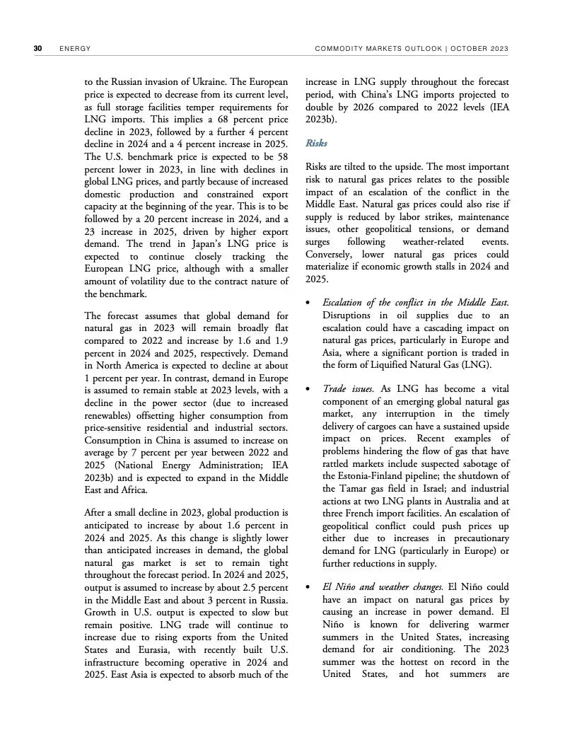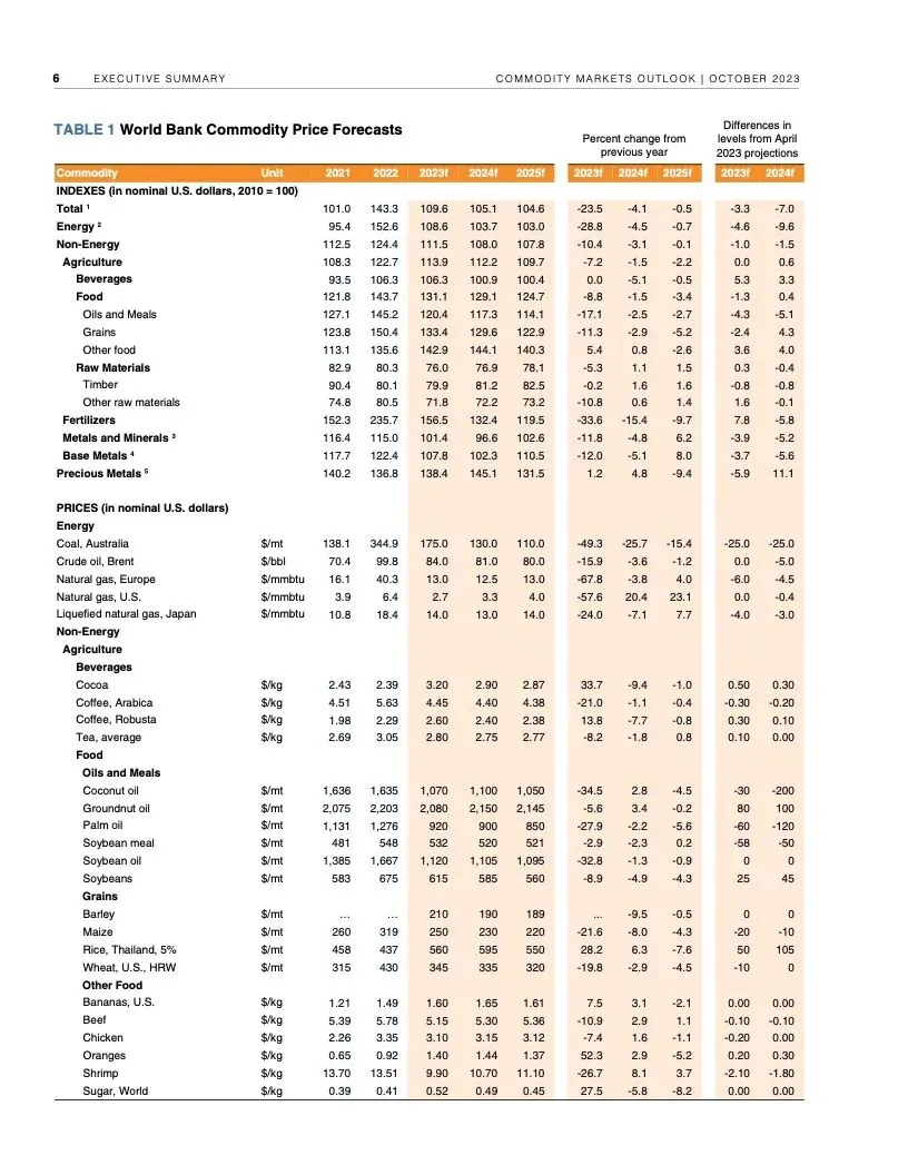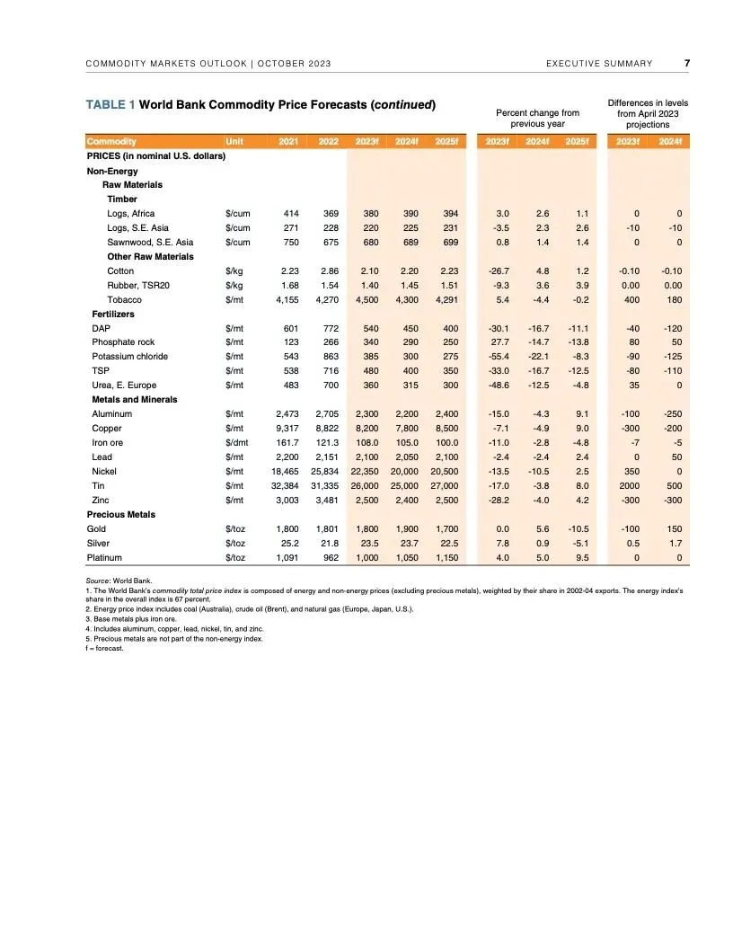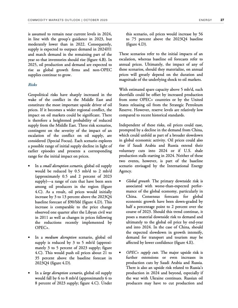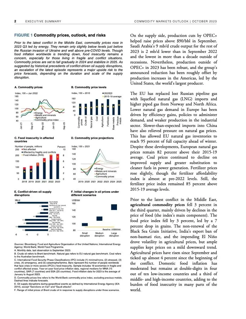 报告初步评估了冲突对大宗商品市场可能产生的近期影响。报告认为,如果冲突不扩大,影响应该有限。根据世行的基线预测,本季度油价预计平均每桶90美元,明年随着全球经济增长放缓而回落至平均每桶81美元。大宗商品价格预计明年下降4.1%。随着供应增加,明年农业大宗商品价格预计会下行。2024年基本金属价格预测下降5%。2025年大宗商品价格有望趋于稳定。