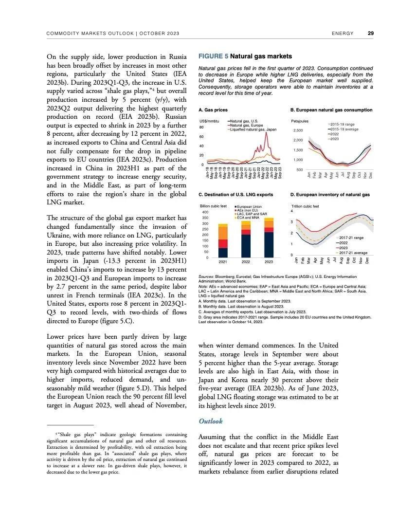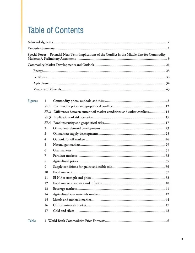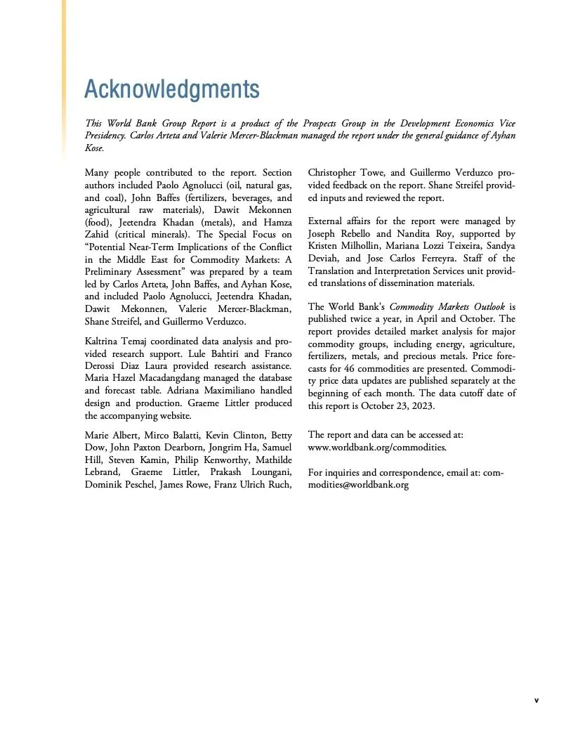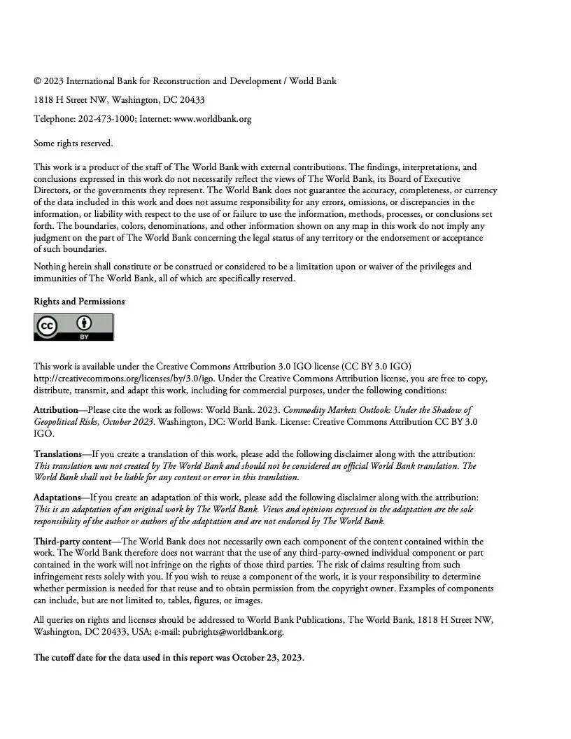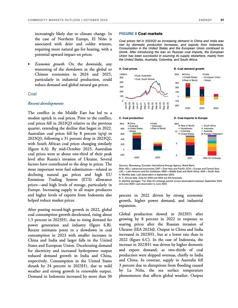 报告初步评估了冲突对大宗商品市场可能产生的近期影响。报告认为,如果冲突不扩大,影响应该有限。根据世行的基线预测,本季度油价预计平均每桶90美元,明年随着全球经济增长放缓而回落至平均每桶81美元。大宗商品价格预计明年下降4.1%。随着供应增加,明年农业大宗商品价格预计会下行。2024年基本金属价格预测下降5%。2025年大宗商品价格有望趋于稳定。