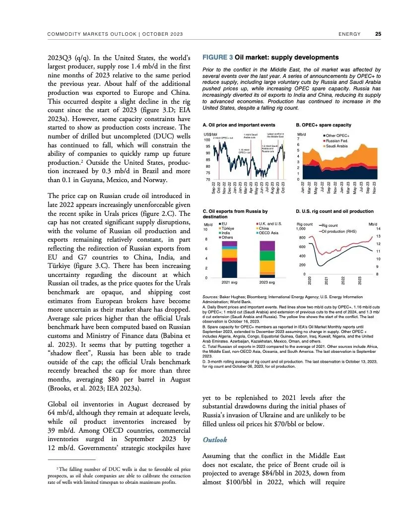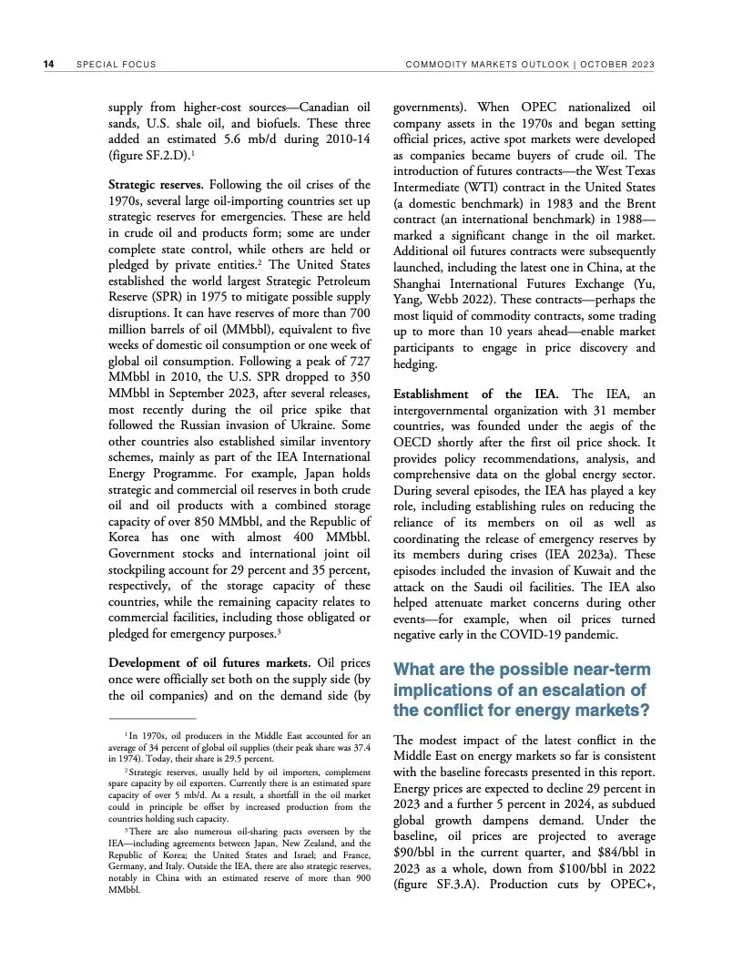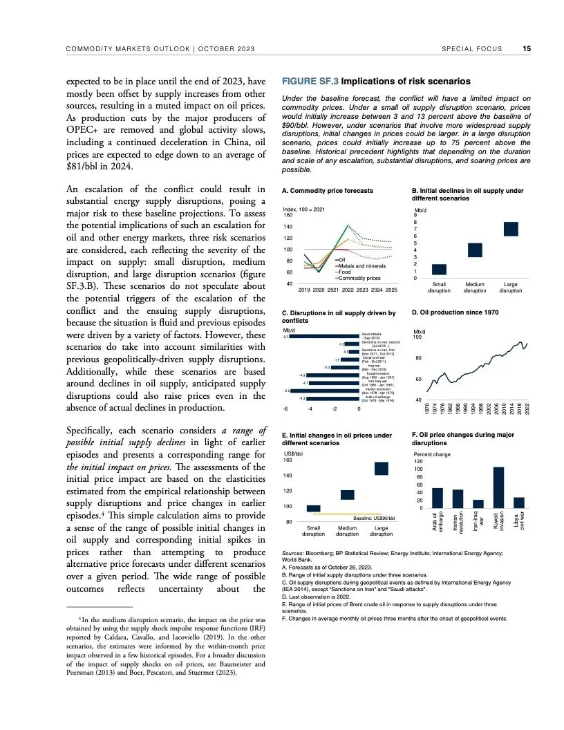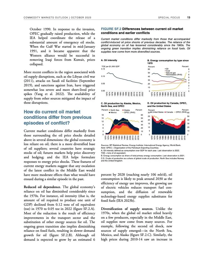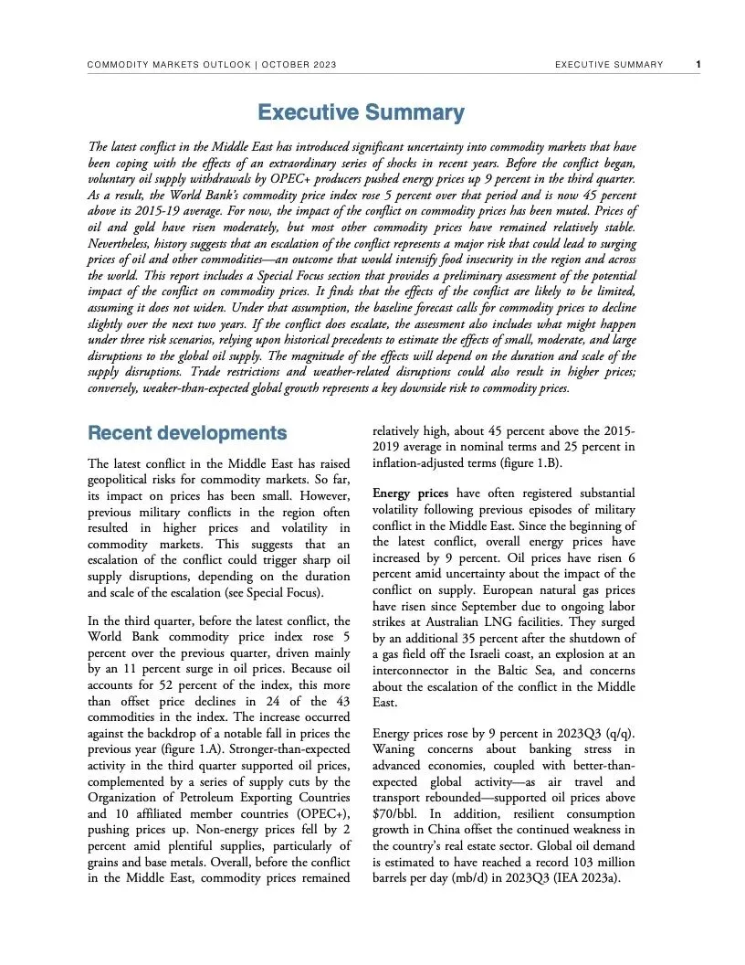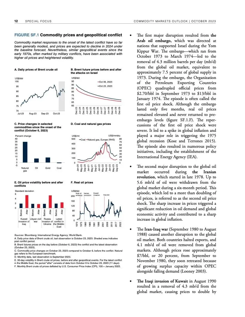 世界银行最新一期《大宗商品市场展望》指出,尽管全球经济远比1970年代更有能力应对重大油价冲击,但如果中东最近发生的冲突继续升级,加上俄乌冲突造成的扰乱,全球大宗商品市场可能被推向未知水域。