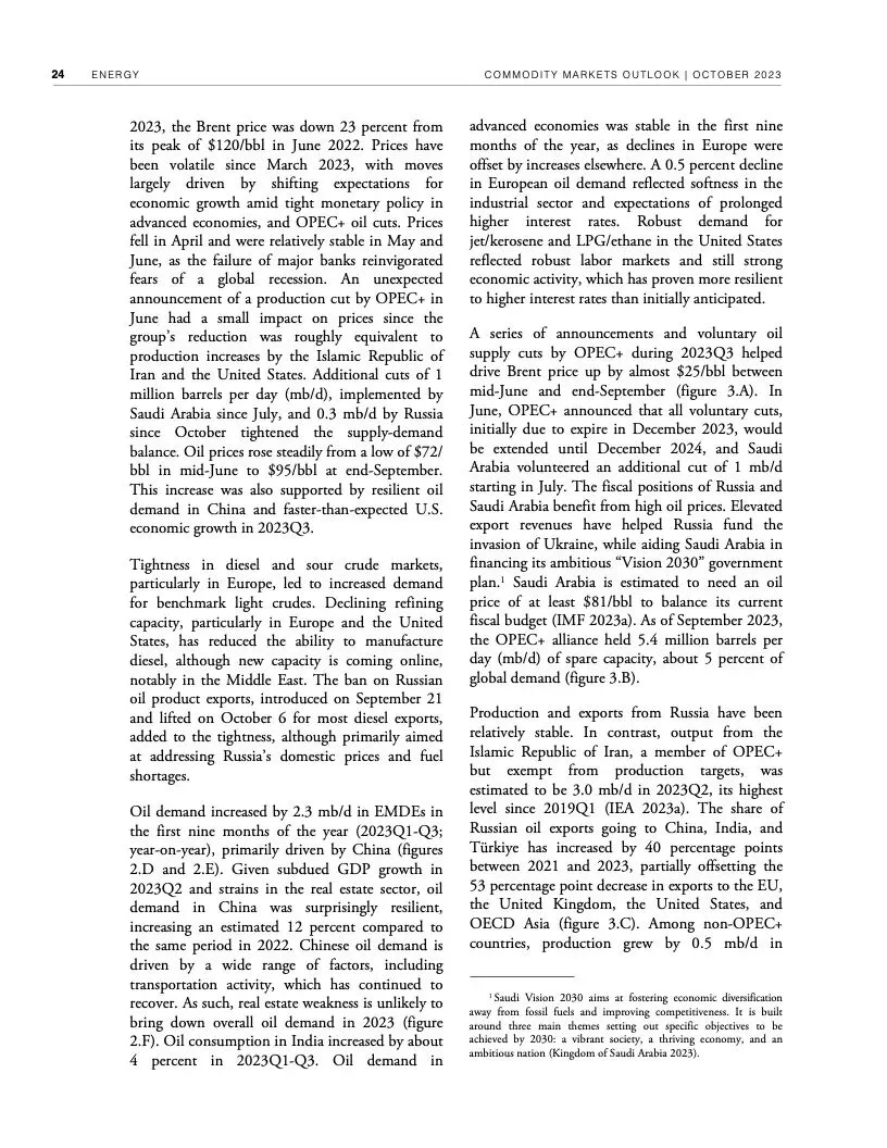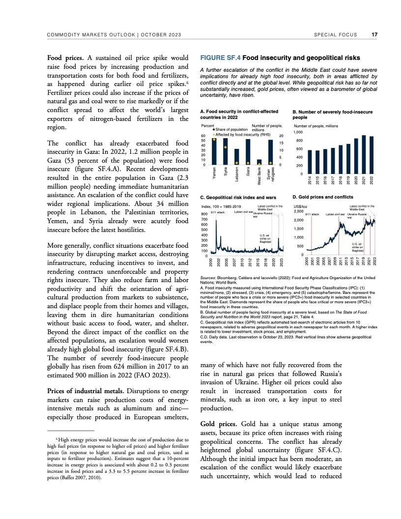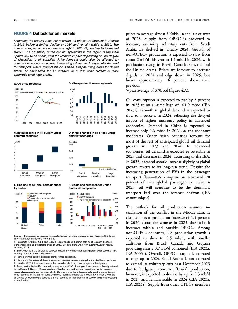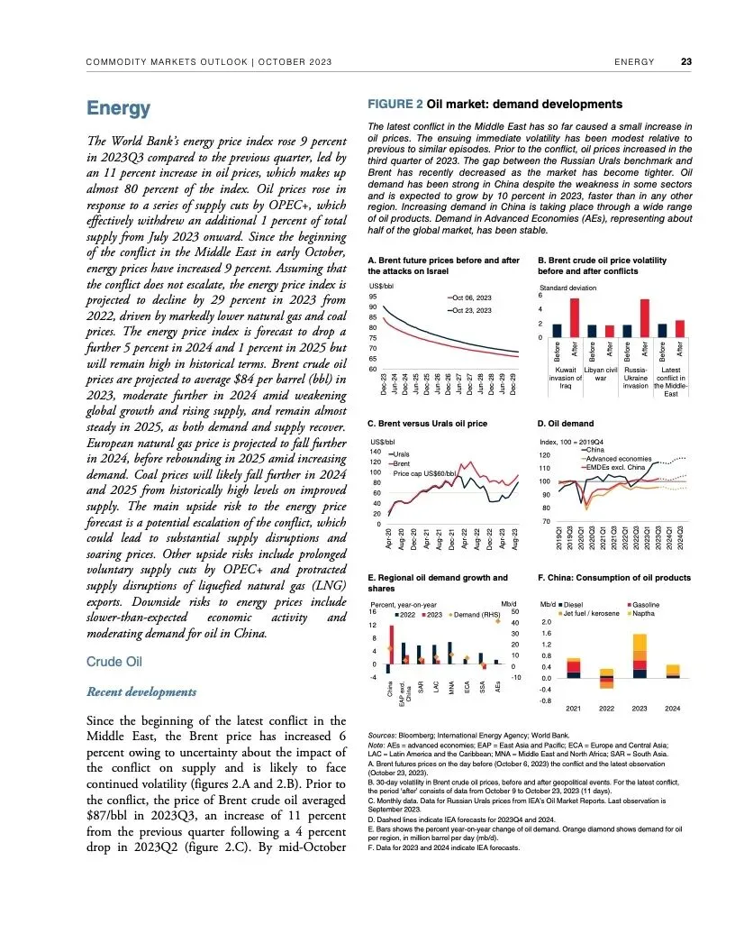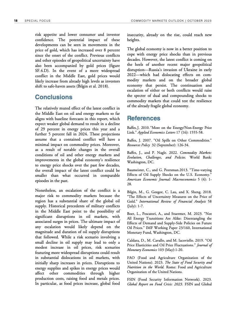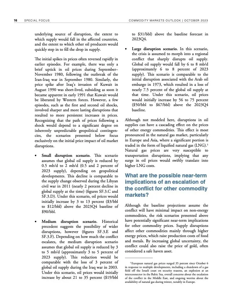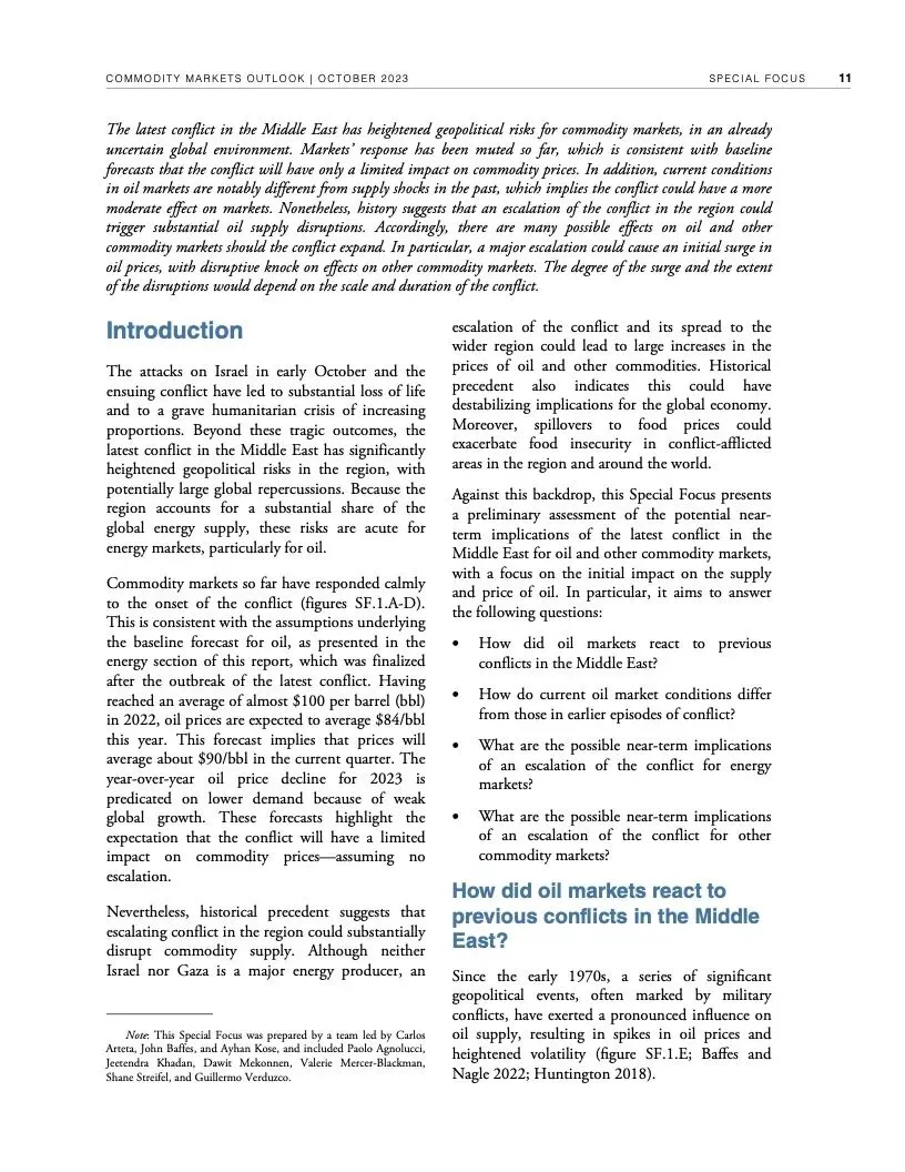 世界银行最新一期《大宗商品市场展望》指出,尽管全球经济远比1970年代更有能力应对重大油价冲击,但如果中东最近发生的冲突继续升级,加上俄乌冲突造成的扰乱,全球大宗商品市场可能被推向未知水域。