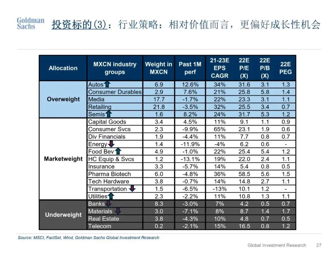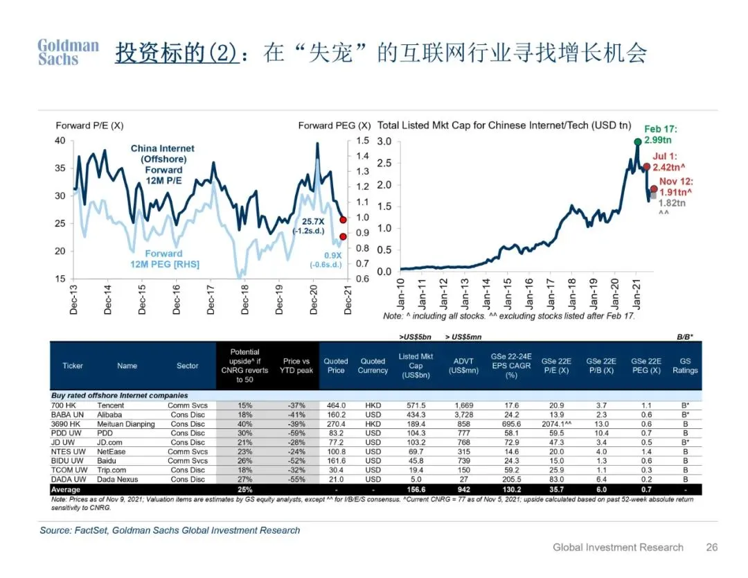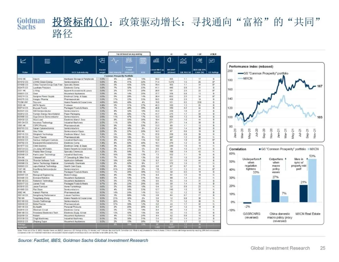 高盛在股票市场推荐的策略是看好“成长”,寻找增长机会,尤其是与政策挂钩的领域,例如“共同富裕”,具体是指大宗消费、科技创新、新能源、国企改革四个领域。