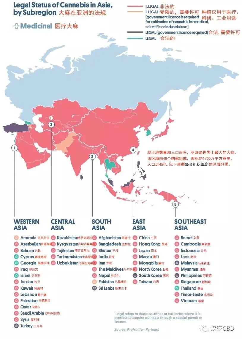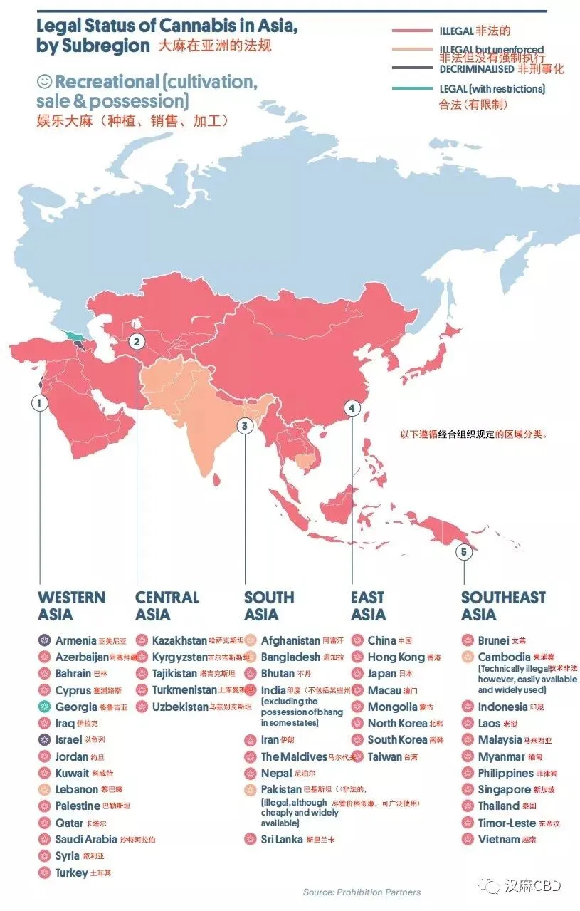 以下地图概述了整个南亚、东亚和东南亚的各国大麻法规情况。