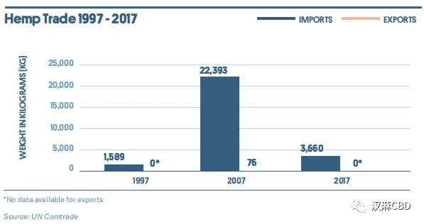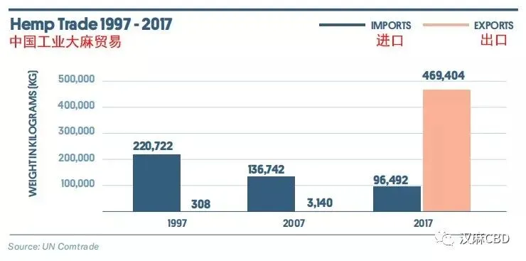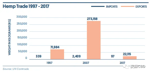 目前大麻提取物包括大麻二酚(CBD)只允许出口,其他工业大麻产品则部分出口,下图为20年间中国工业大麻贸易的变化: