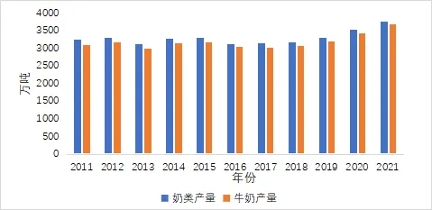图1 2011—2021年中国奶类和牛奶产量变化情况