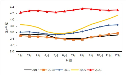 生鲜乳价格高位运行,主要奶制品零售价格均上涨。受饲料价格助推及国际海运价格上涨等因素影响,2021年国内生鲜乳价格保持高位运行。据农业农村部数据,全年价格4.29元/千克,比上年上涨13.2%。与往年相比,2021年生鲜乳价格波动不大,值得关注的是,8月份后生鲜乳价格连续三个月下行,累计跌幅1.0%(图3)。受国内上游生鲜乳价格高位运行的影响,城市鲜奶和奶粉零售价格均上涨;2021年,全国监测城市鲜奶平均零售价11.09元/千克,比上年上涨2.7%;三段婴幼儿配方奶粉平均零售价格234.38元/千克,比上年上涨6.3%。