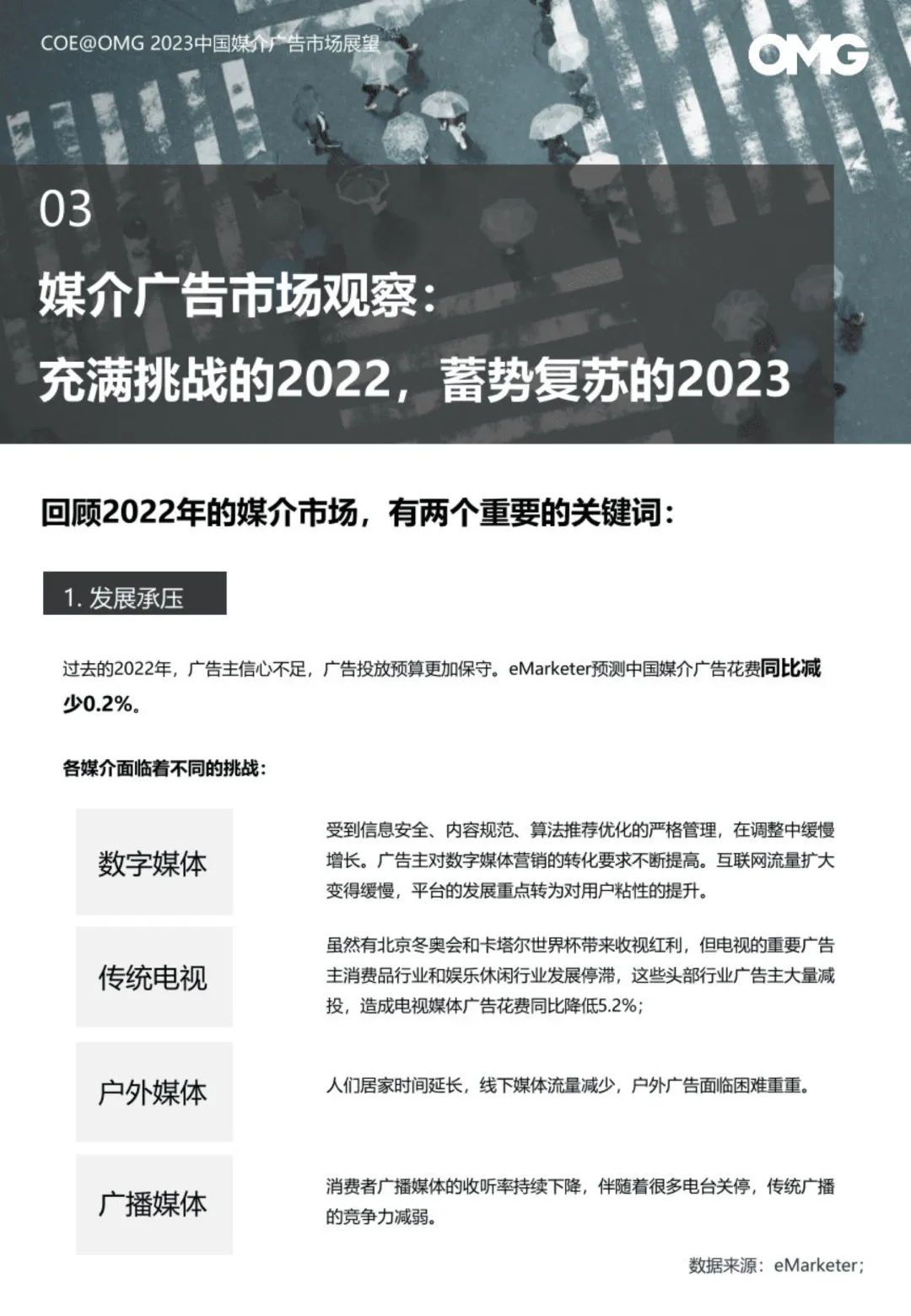 摘要:回顾2022年,是充满挑战和不确定性的一年。2023年将蓄势复苏,媒介广告市场将面临更多机遇和挑战。