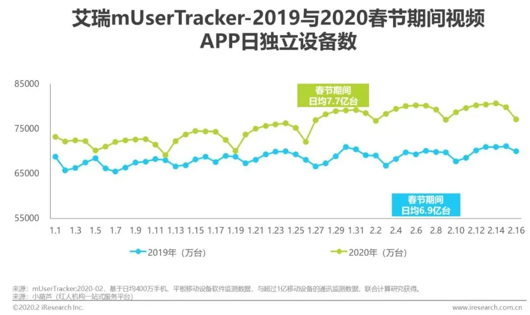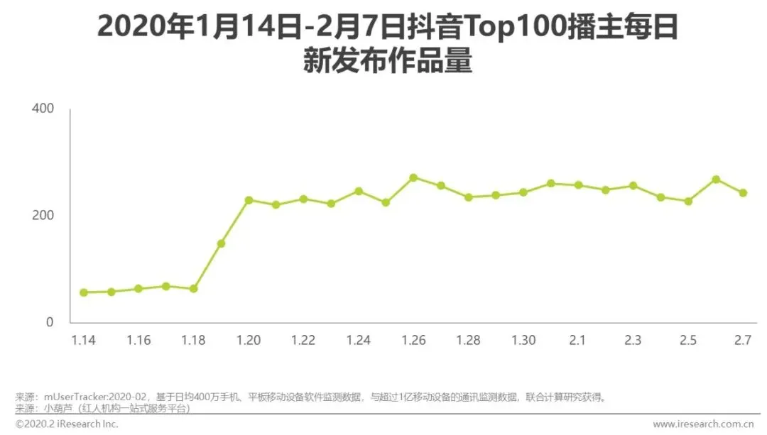 春节期间,由于不能外出及电影院线受到疫情影响,长视频及短视频平台异常火爆,用户活跃度大幅增长。根据艾瑞mUserTracker的监测数据可以看出,视频APP的日独立设备数从疫情开始后就节节攀升,在春节期间日均独立设备数更是达到7.7亿台,也并没有同往常一样在春节假期过后数量下降。在短视频方面,根据小葫芦的监测数据可以看出,抖音Top100播主自1月19日起每日新发布作品量也稳定维持在了每日200+条,与疫情爆发前产生鲜明对比。