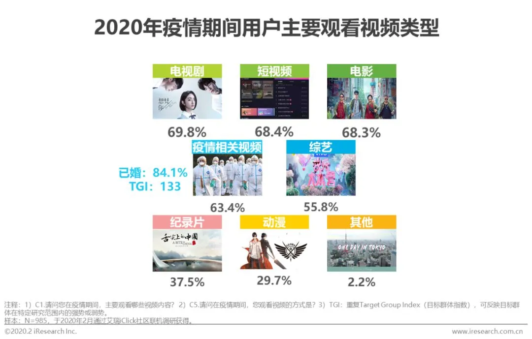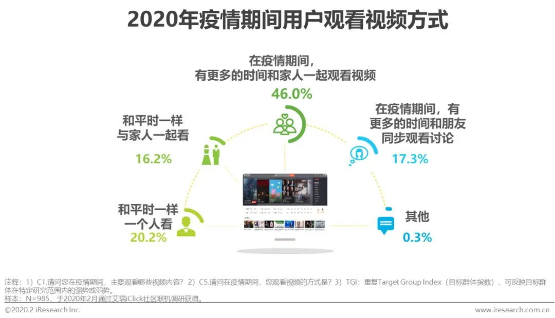 艾瑞iClick用户调研数据显示,在疫情期间,用户主要观看的视频类型还是以影视剧及短视频为主,占比均超过65%,此外,疫情相关视频也受到重视,占比达到63.4%,其中已婚人士较单身人士关注的倾向性更高,达133。而在视频的观看方式上面,相较平时,用户在宅家疫情期也有了更多的时间去陪伴家人,占比远超其他,达到46.0%。